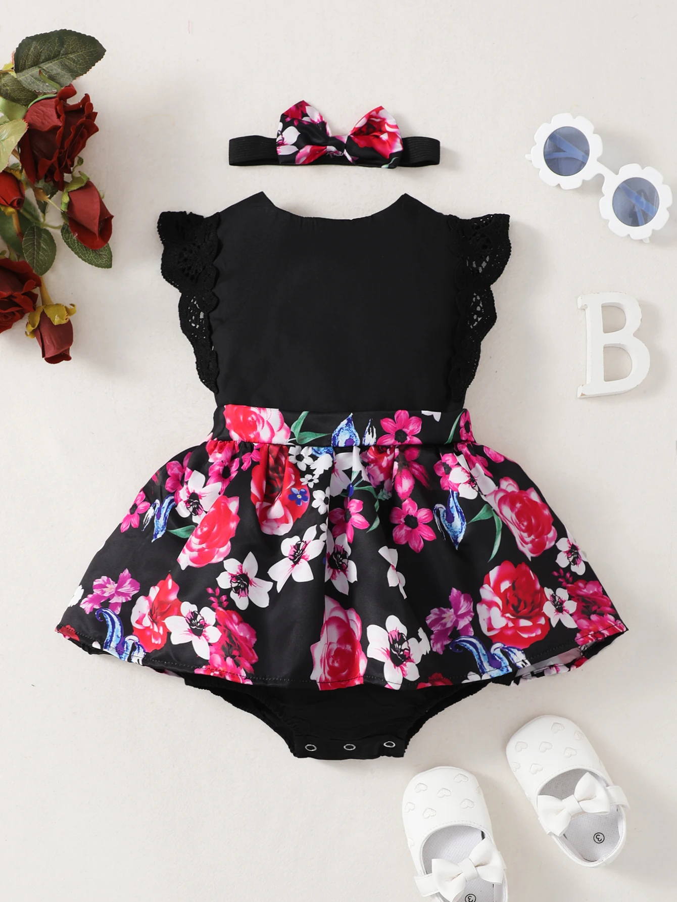 Order now and dress your baby girl in style with our Sleeveless Lace Flower Print Dress!