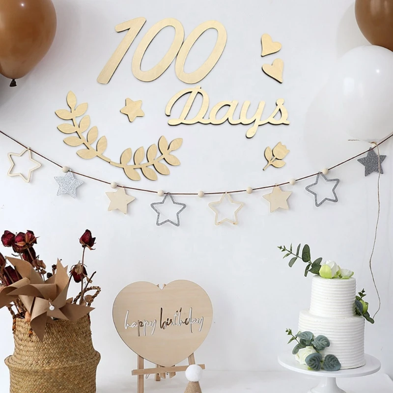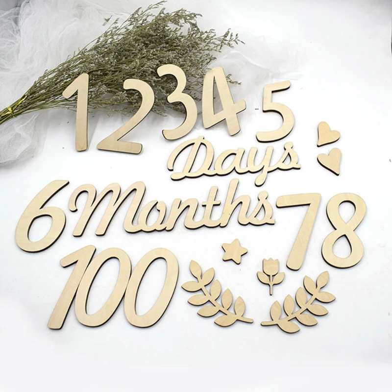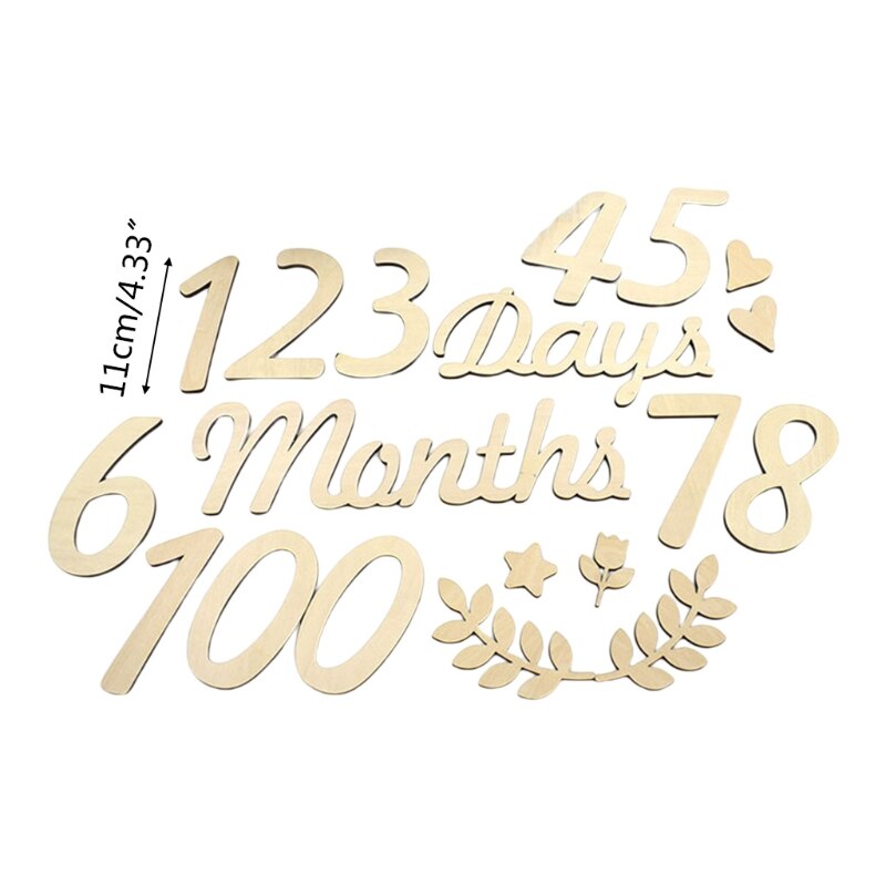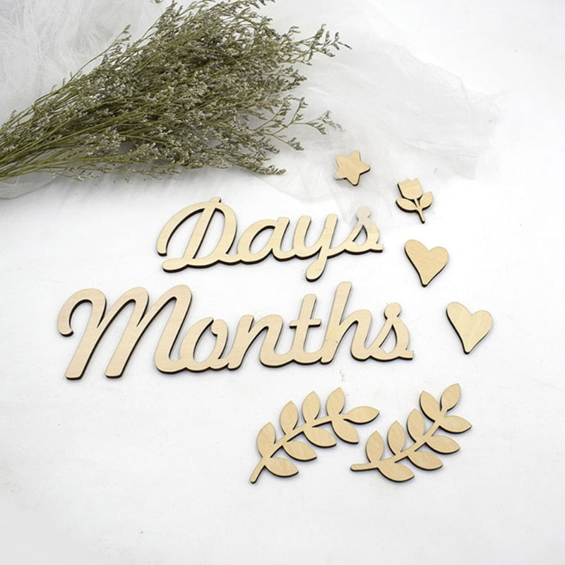 Cutouts include the word "days", "months", , numbers 0, 0, 1, 1, 2, 3, 4, 5, 6, 7, 8, 9, and 10 symbols which includes the "love" "star" "leaves" wooden cards. In total, this set includes 18 cutout cards. These beautifully designed Baby Milestone Markers are a unique baby shower gift for expecting mothers and a great addition to any gift registry.