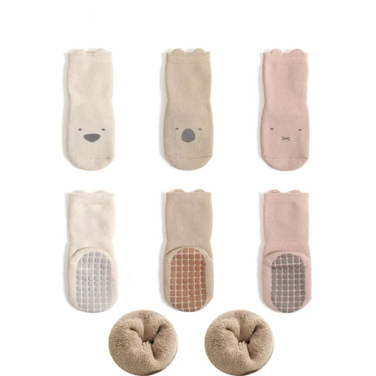 Introducing our Winter Anti-Slip Cartoon Baby Socks, the perfect blend of comfort, warmth, and adorable style. This set of three pairs is designed to keep your little one's feet snug during the chilly winter season.