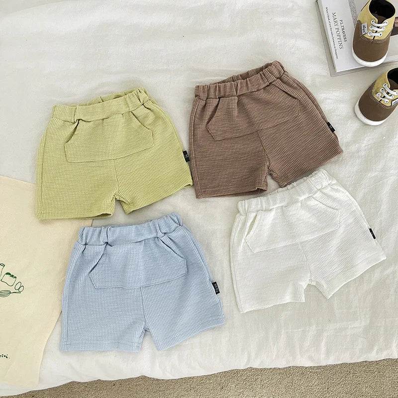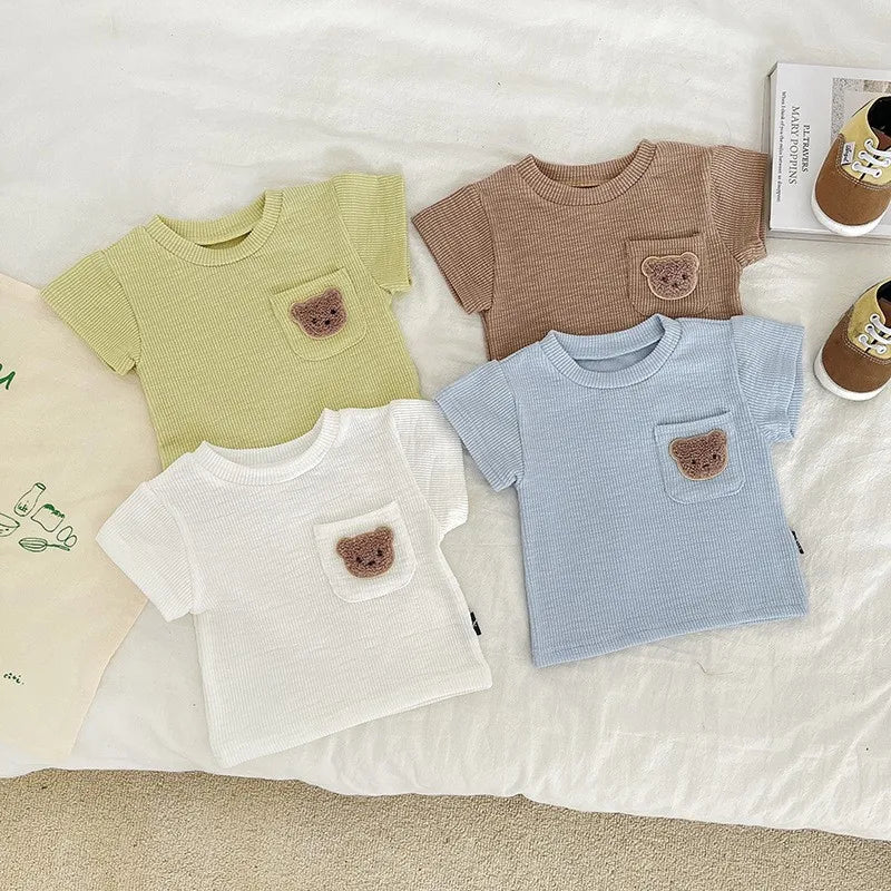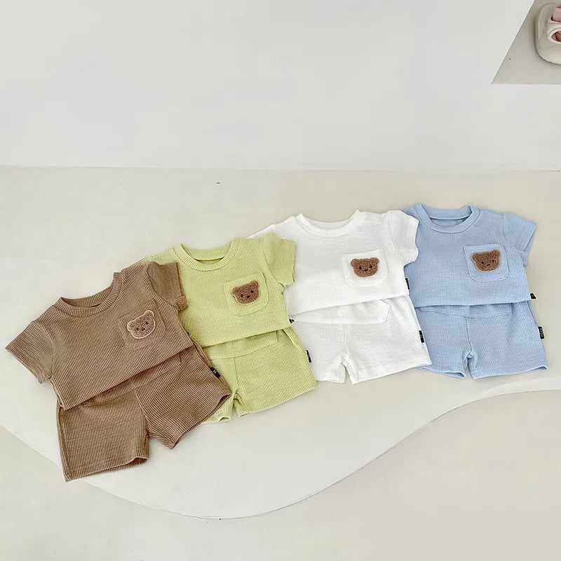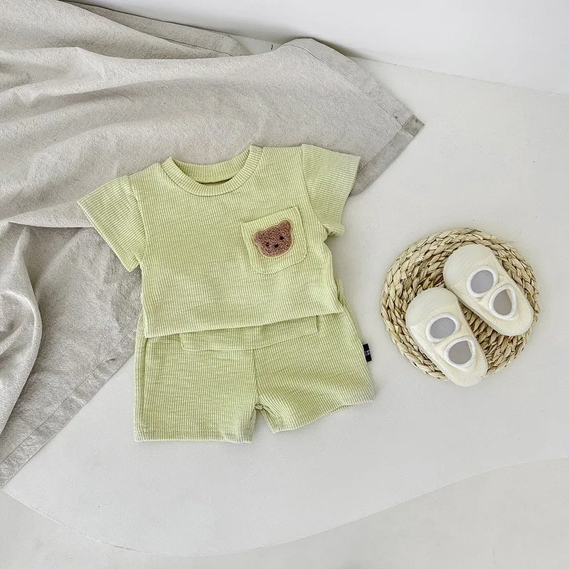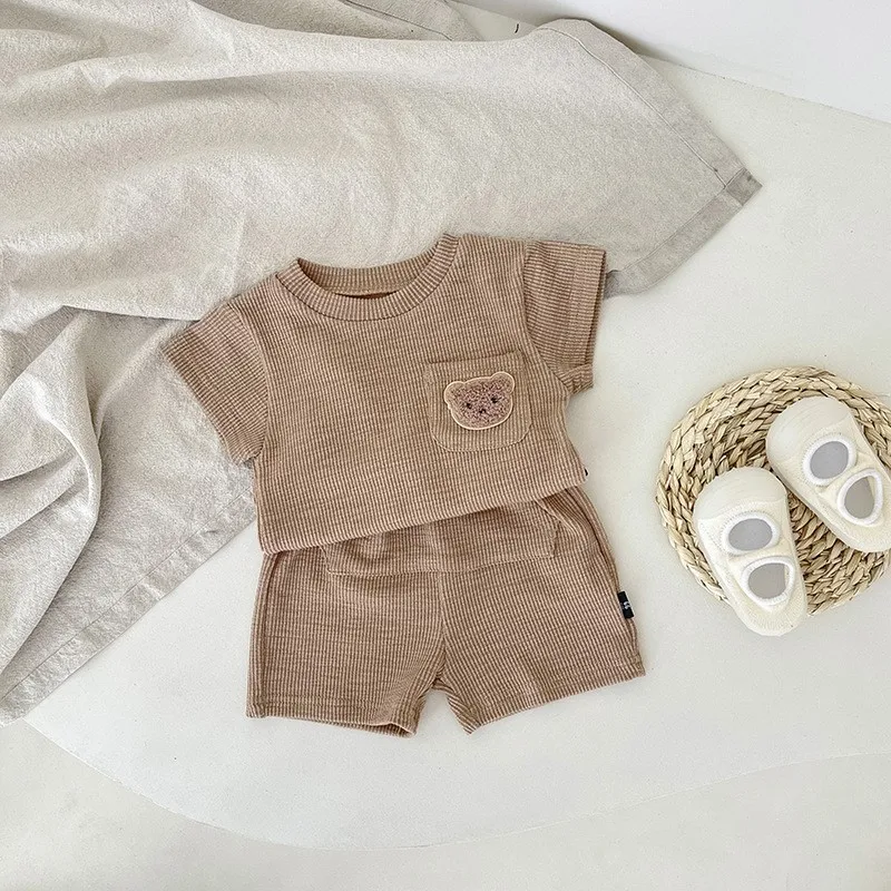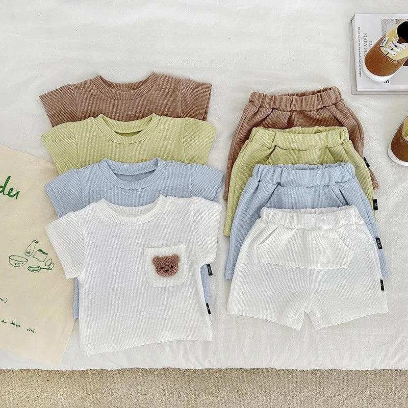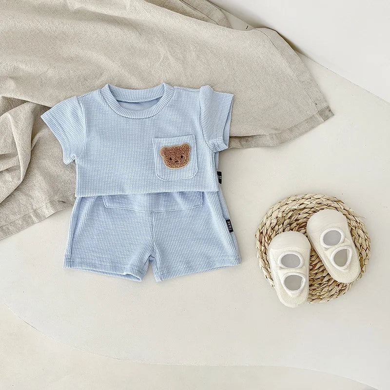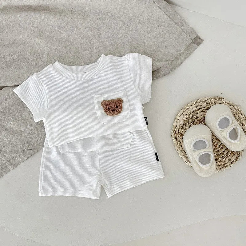 Baby Summer Bear Embroidery Set: Solid Tops + Cotton Shorts