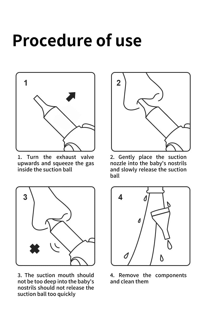 Easy to Use Unlike electronic nasal aspirators, our manual silicone nasal aspirator requires no batteries or complicated setup. Simply squeeze the bulb, place the tip at the entrance of your baby's nostril, and release to suction out the mucus.