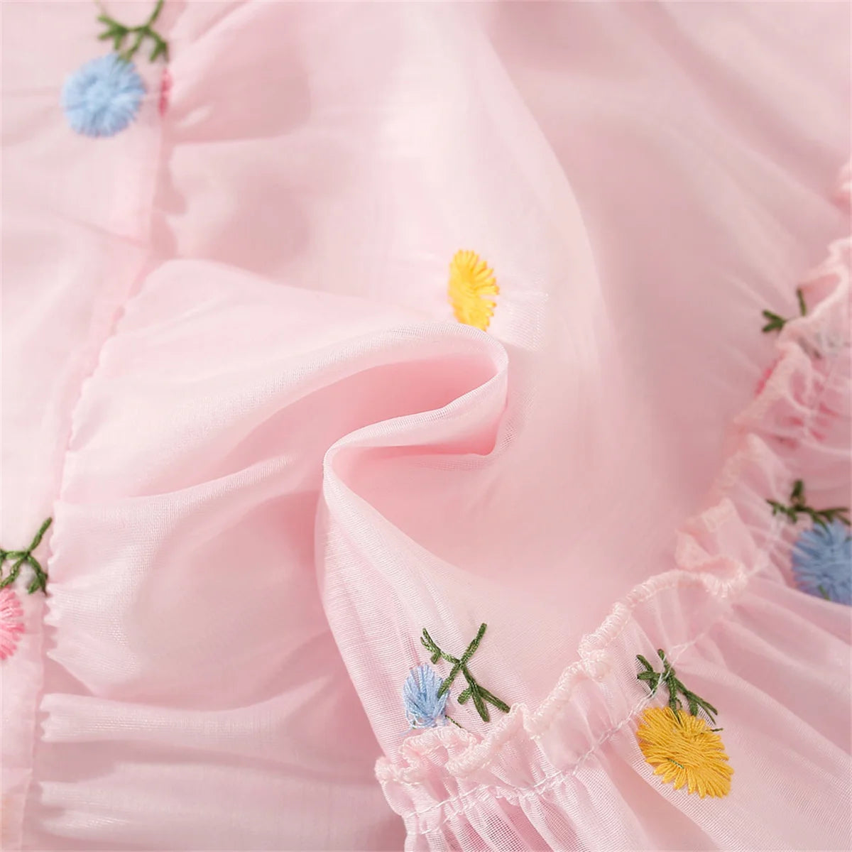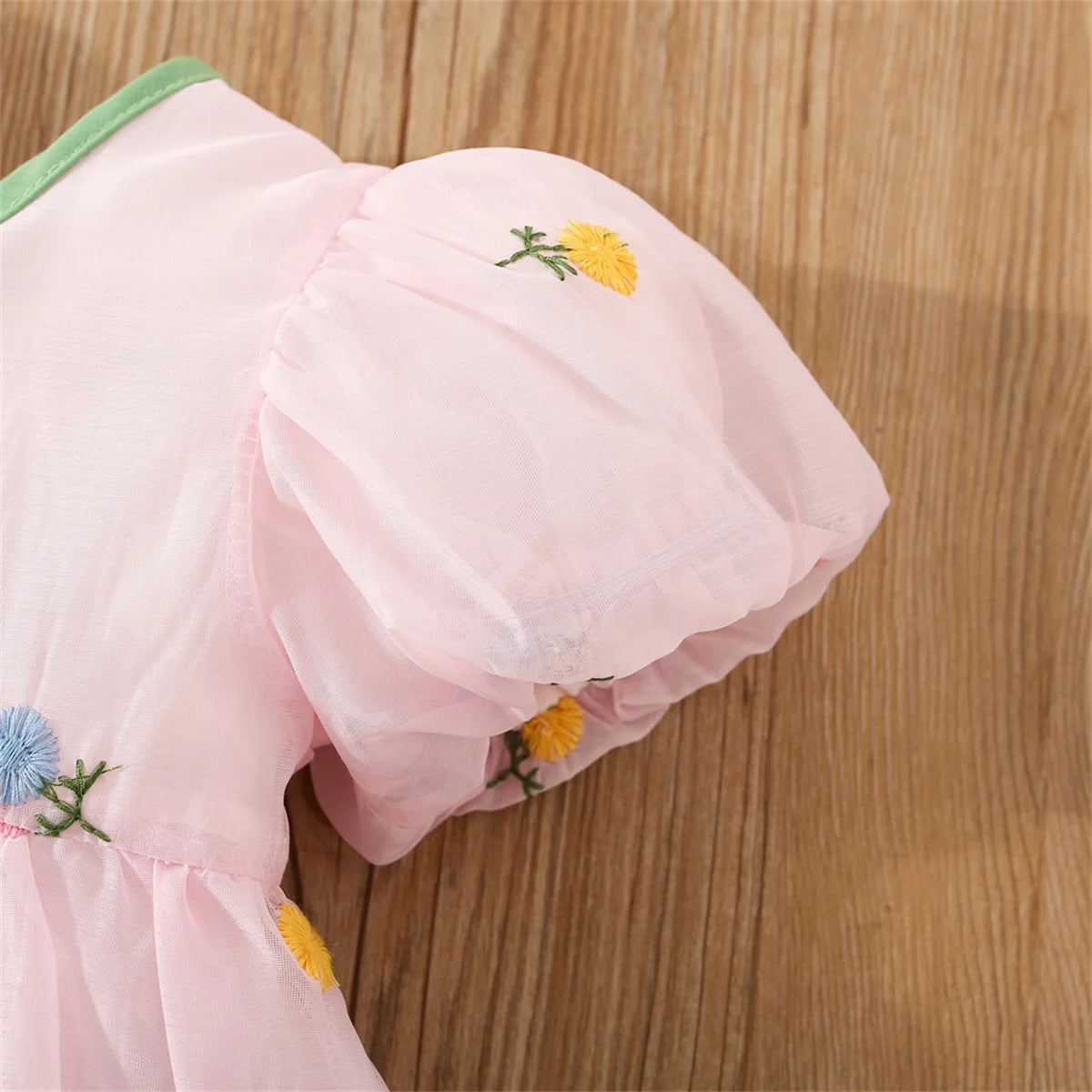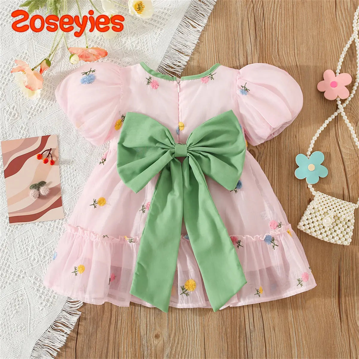 Summer Children'S New Back Bow Flower Embroidery Short Sleeve Solid Round Neck 0-3 Year Old Girls' Dress