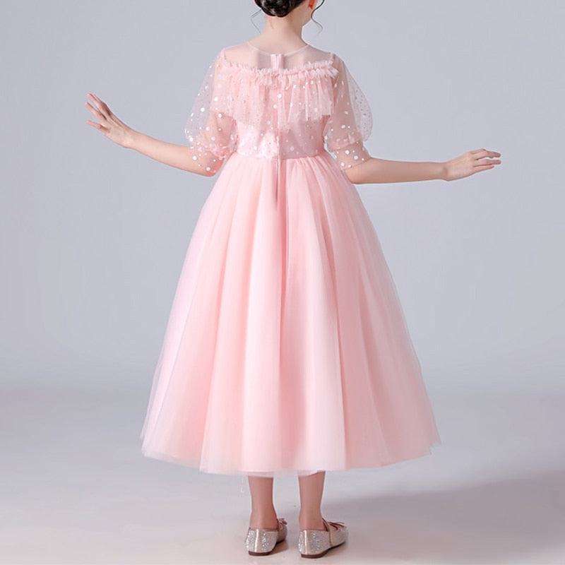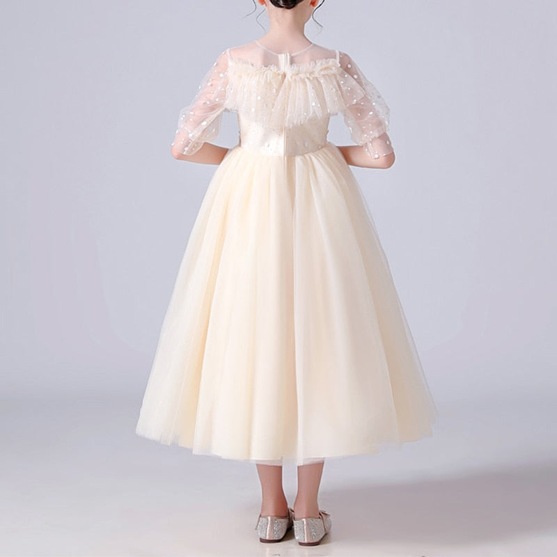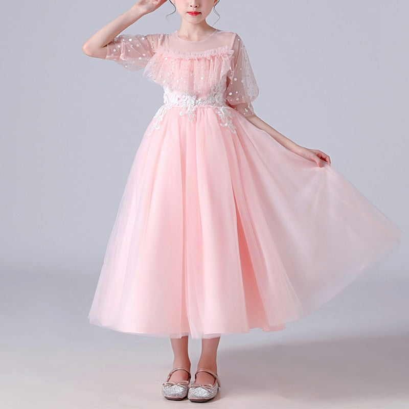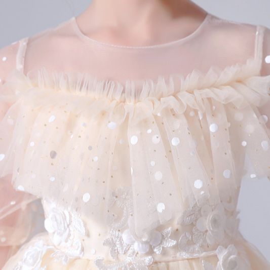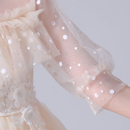 Let's dream, shall we? If you're still looking for the perfect dress for your little princess, then this Dotted See Through Sleeves Ruffle and Lace Girls Party Dress is the one. This dress comes with appliques of flowers, lantern sleeves, and a ball gown silhouette that will be absolutely stunning at her next event.