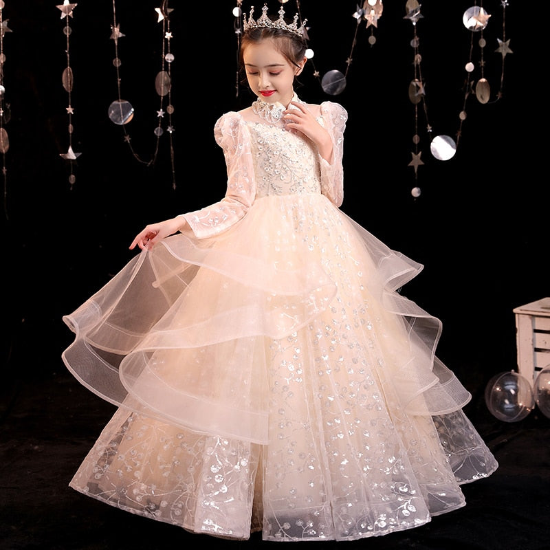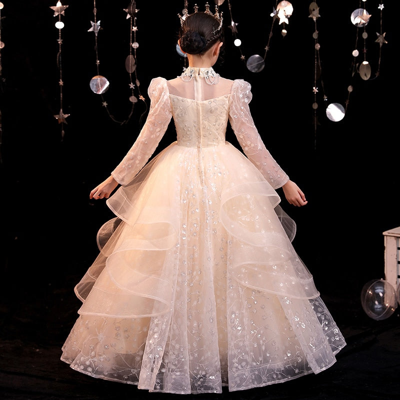 Mesmerize the crowd in this rare design Elegant Sequin Long Sleeve Layer Skirt Gown. Specially tailored for your little girl's special moment to shine! A light-weight quality formal gown that's guaranteed comfortable to the skin.