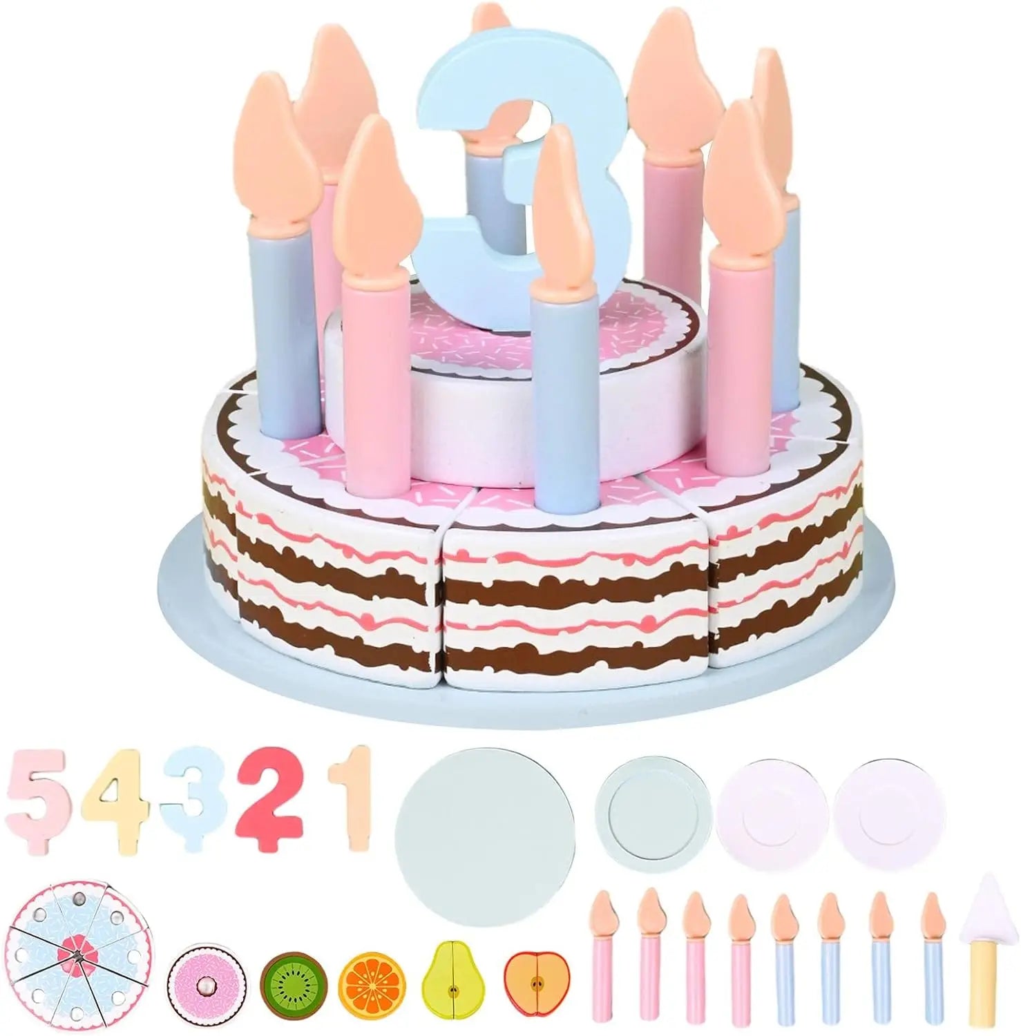 Pieces: 6-slice cake, 9 candles, 1 cake knife, 5 number toppers (1–5), 6 fruit slices, 1 large cake plate, 2 small plates, 1 party hat.