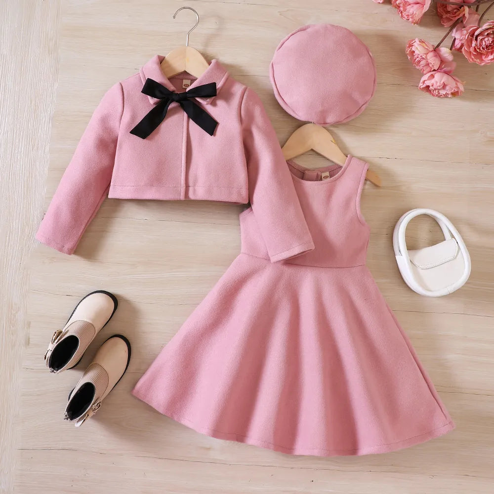 Three-Piece Ensemble: This set includes a Bow Fleece Coat, a Tank Top Dress, and a Beret, providing a complete and coordinated look effortlessly.