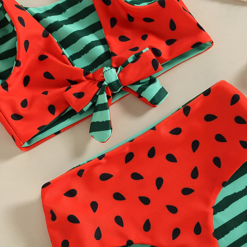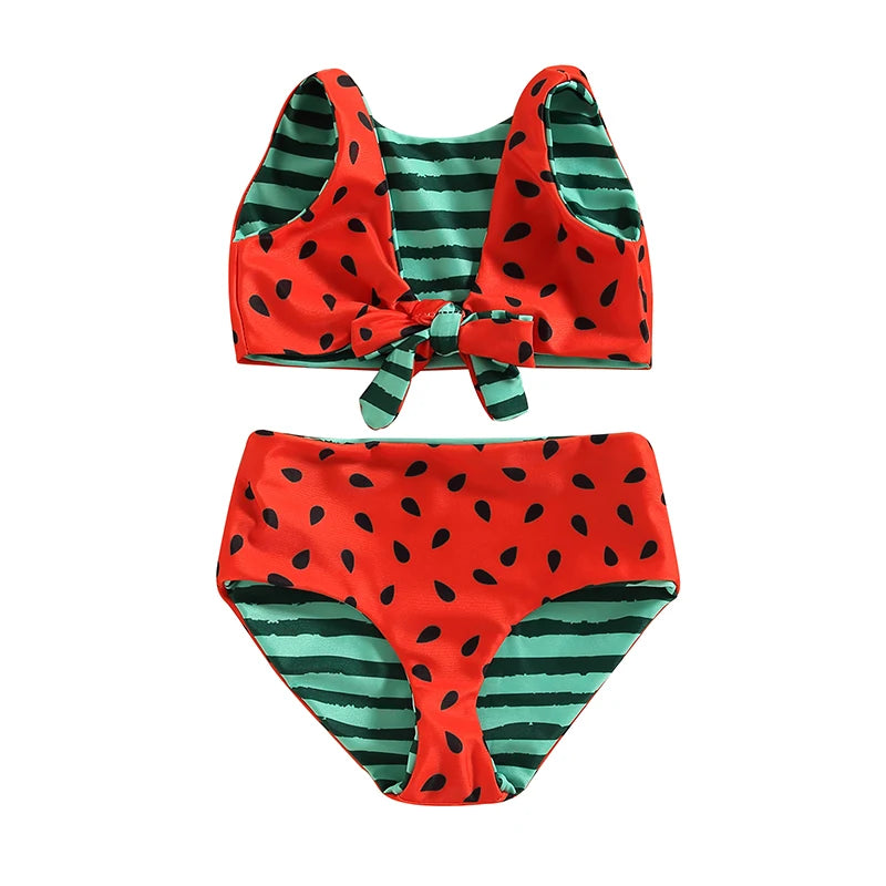 Let your little girl make a splash in style with our adorable two-piece swimsuit featuring a fun watermelon print and striped design. It's sure to stand out at the pool or beach!