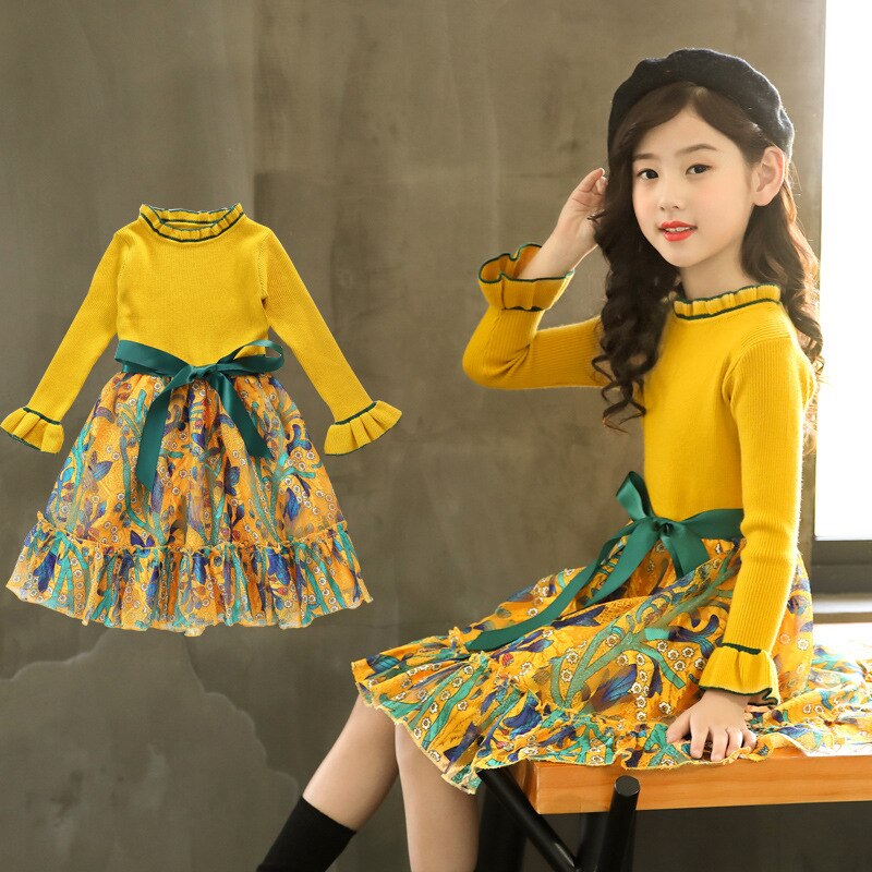 - Ruffle neck, flare long-sleeved dress made of ribbed cotton top and bohemian style skirt bottom.