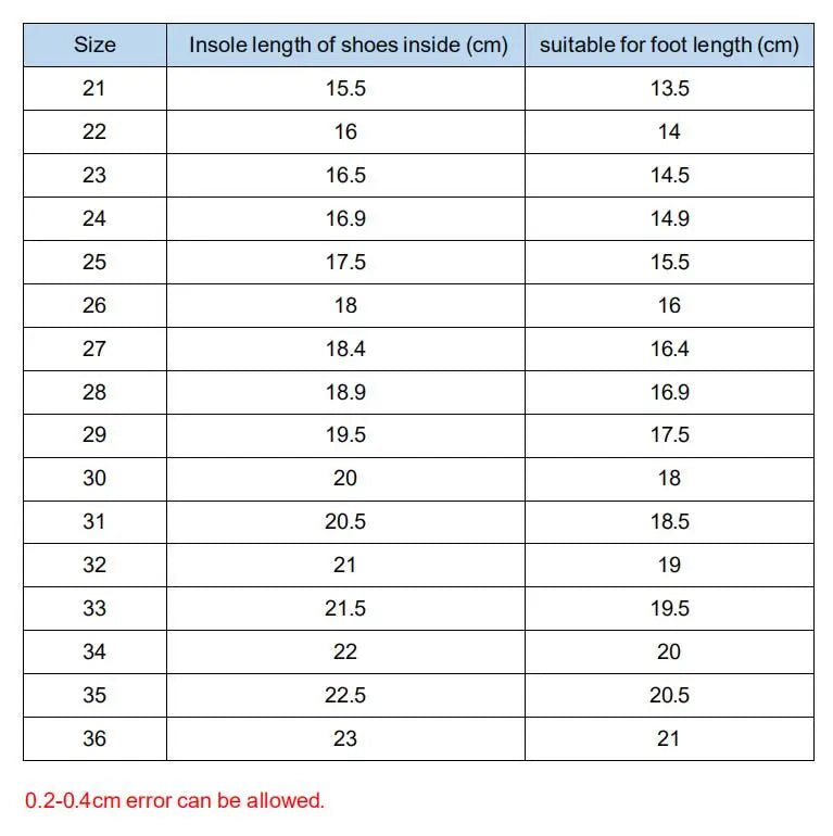 - Size Range: Available in sizes 21 to 36, with inner length approximately 2cm longer than foot length.