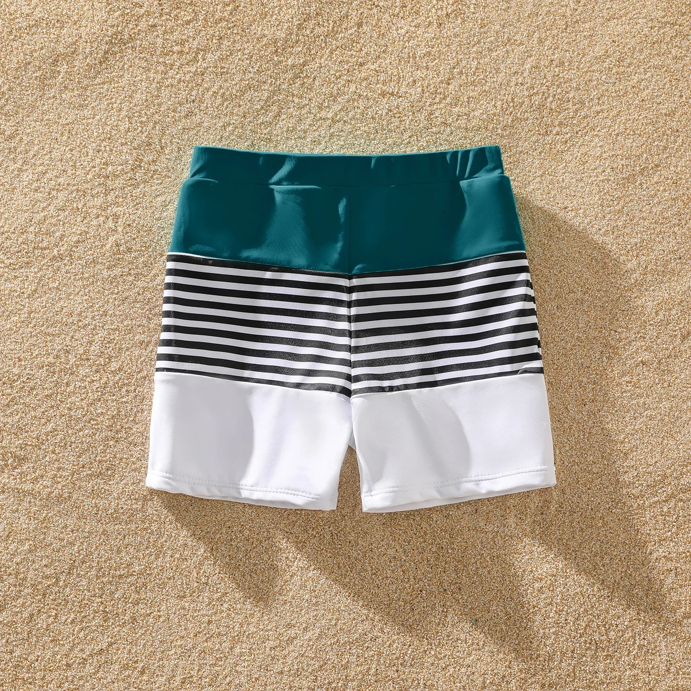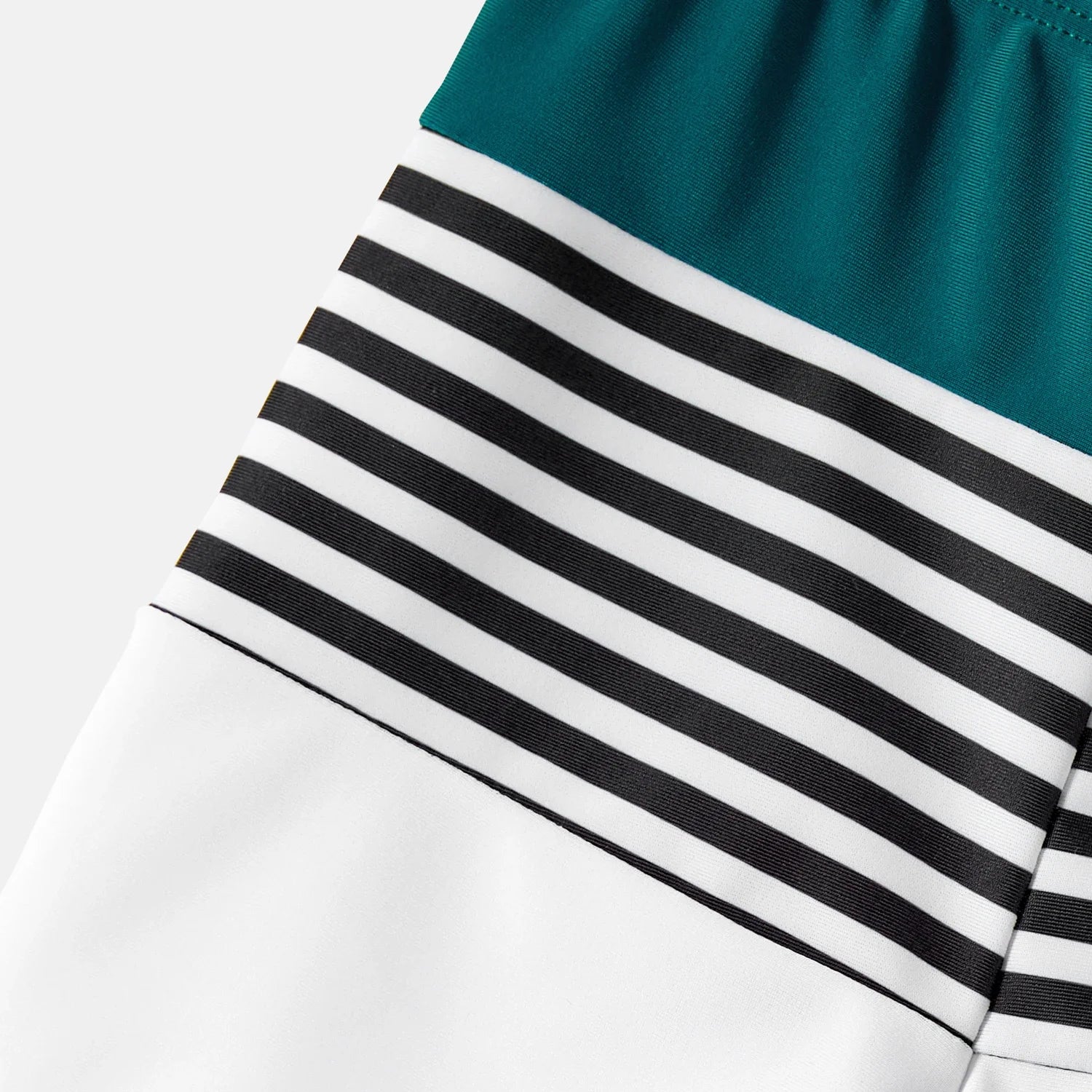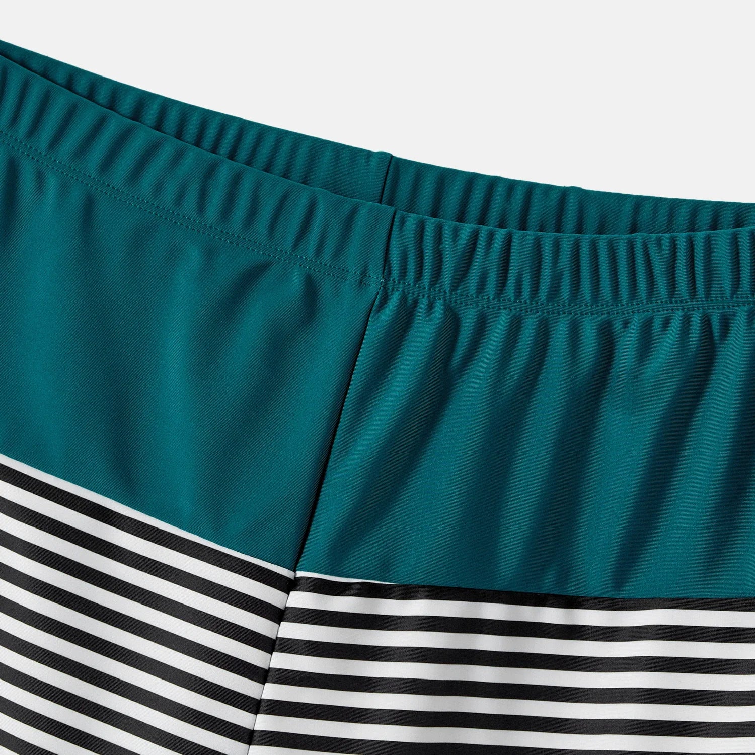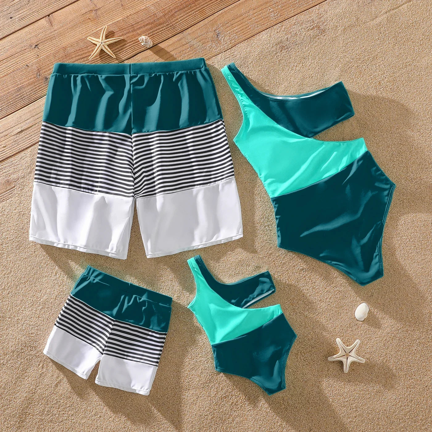 Family Matching: One-Shoulder Swimsuits & Striped Trunks