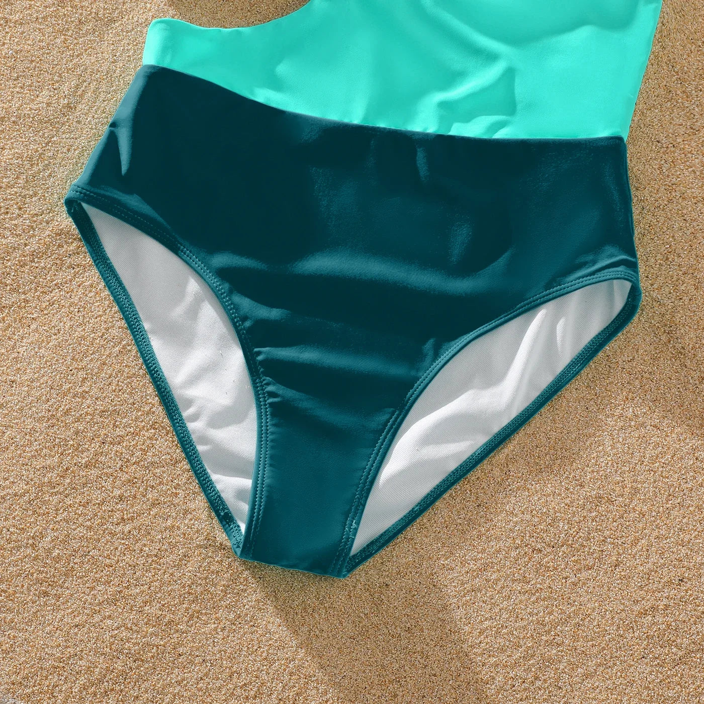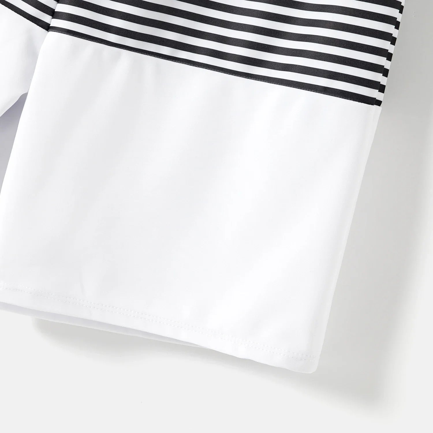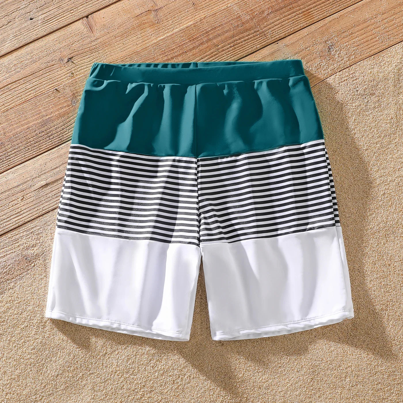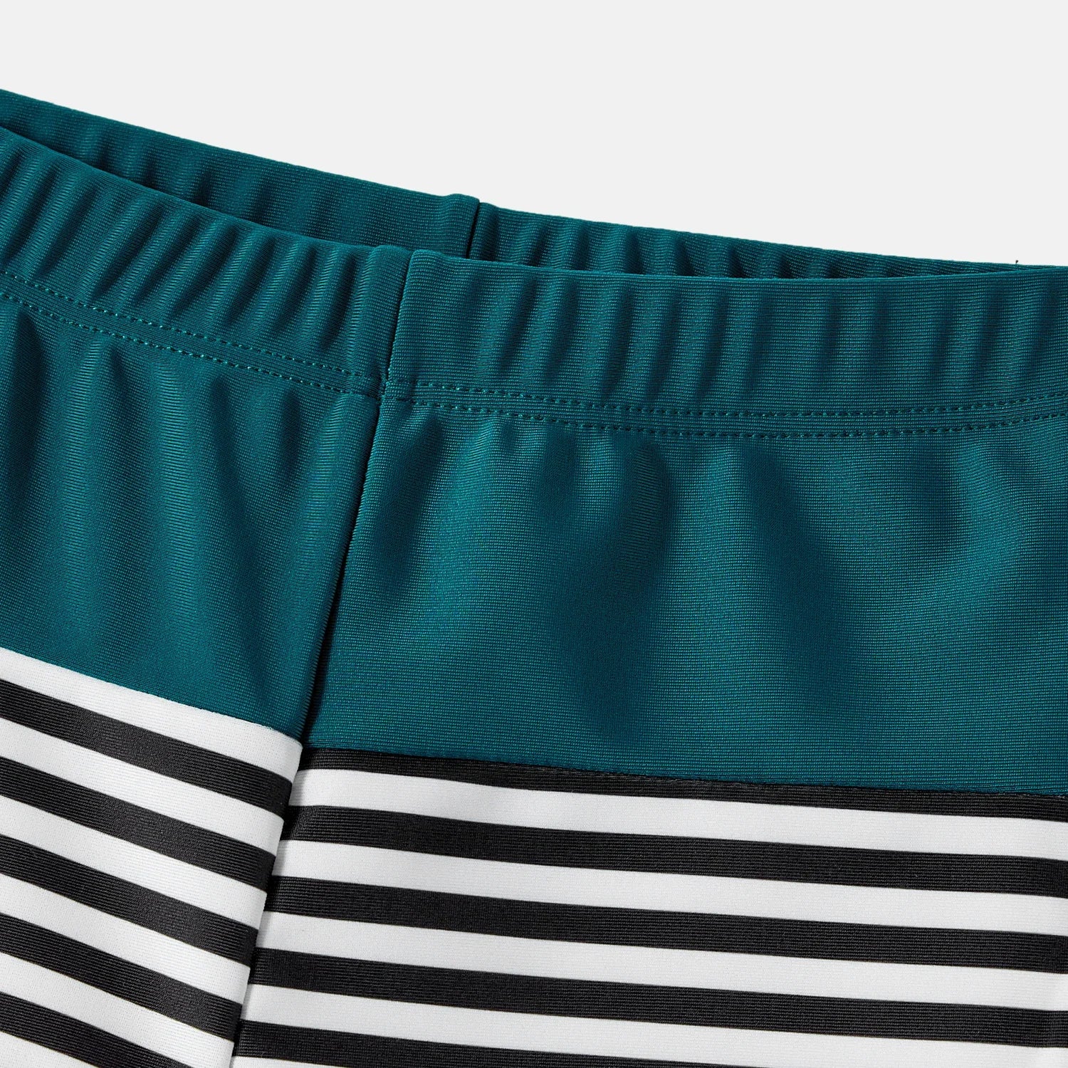 Family Matching: One-Shoulder Swimsuits & Striped Trunks