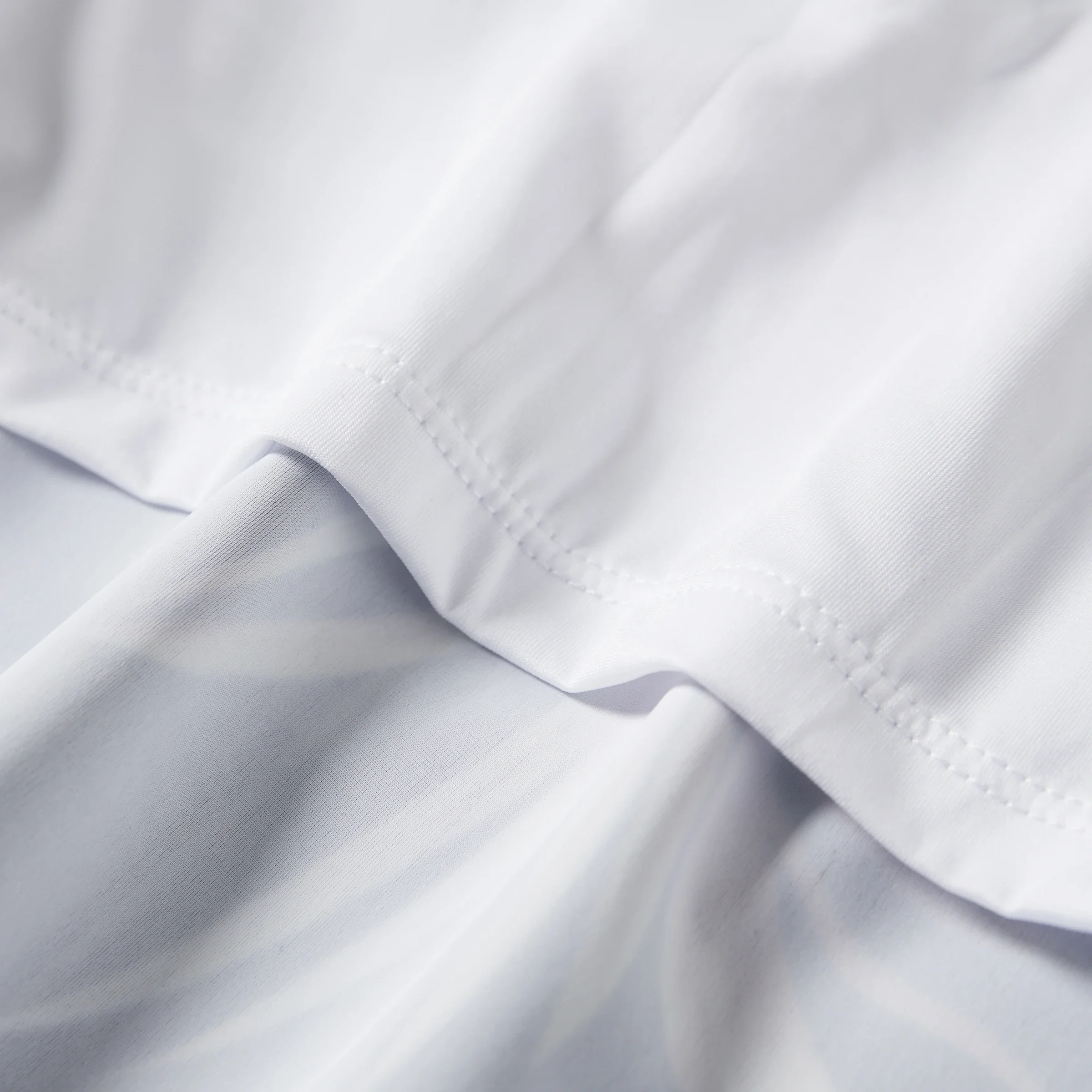 - High-stretch, quick-drying swimsuit material printed with tropical plant patterns.