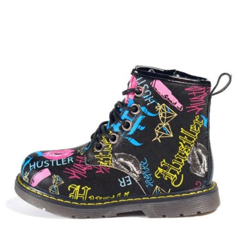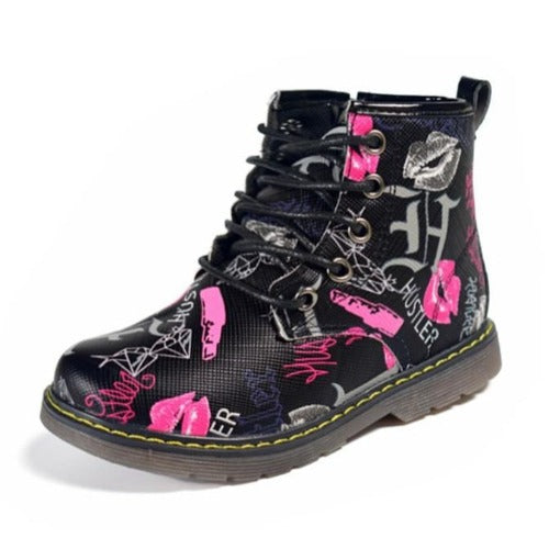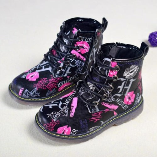 - Graffiti-printed waterproof ankle boots.