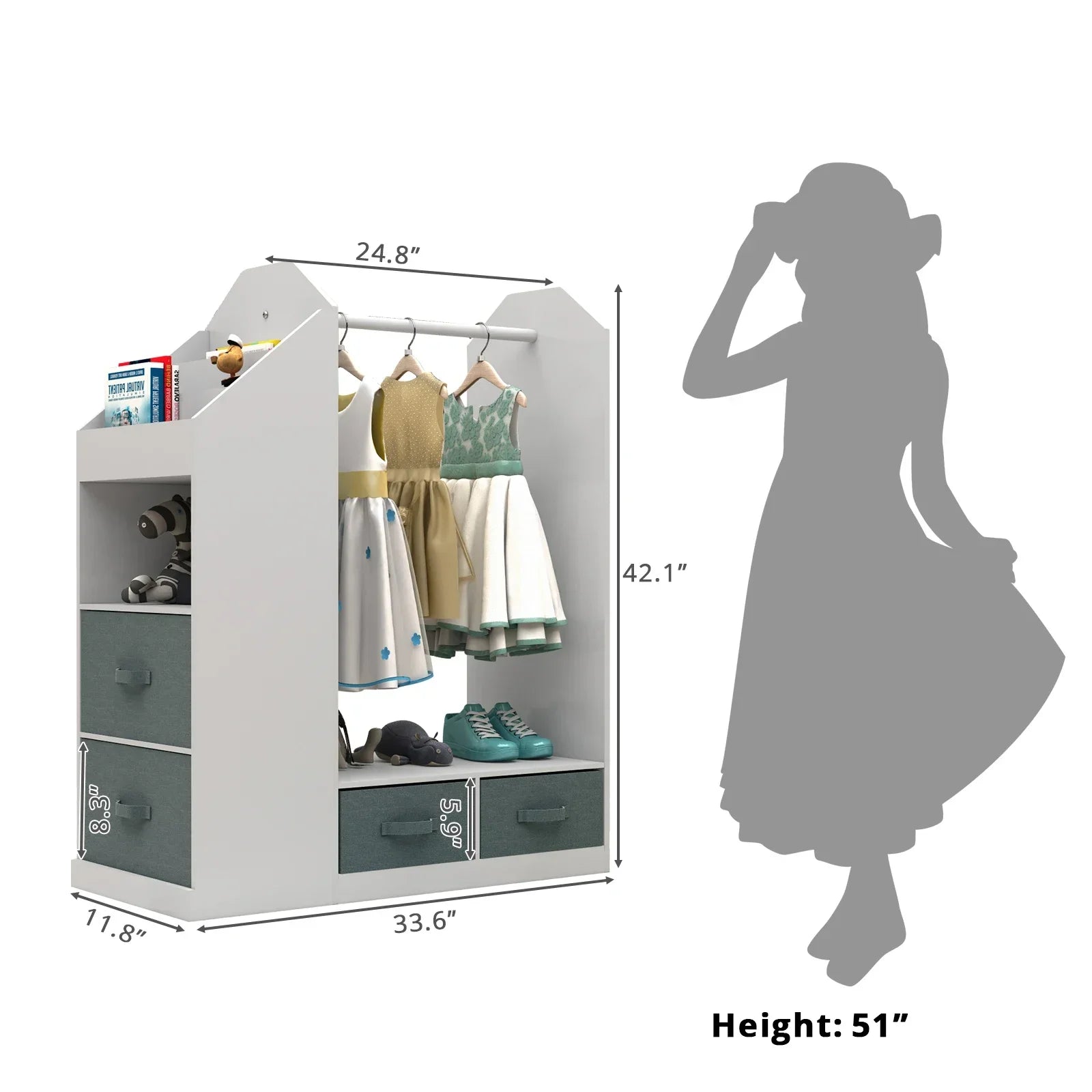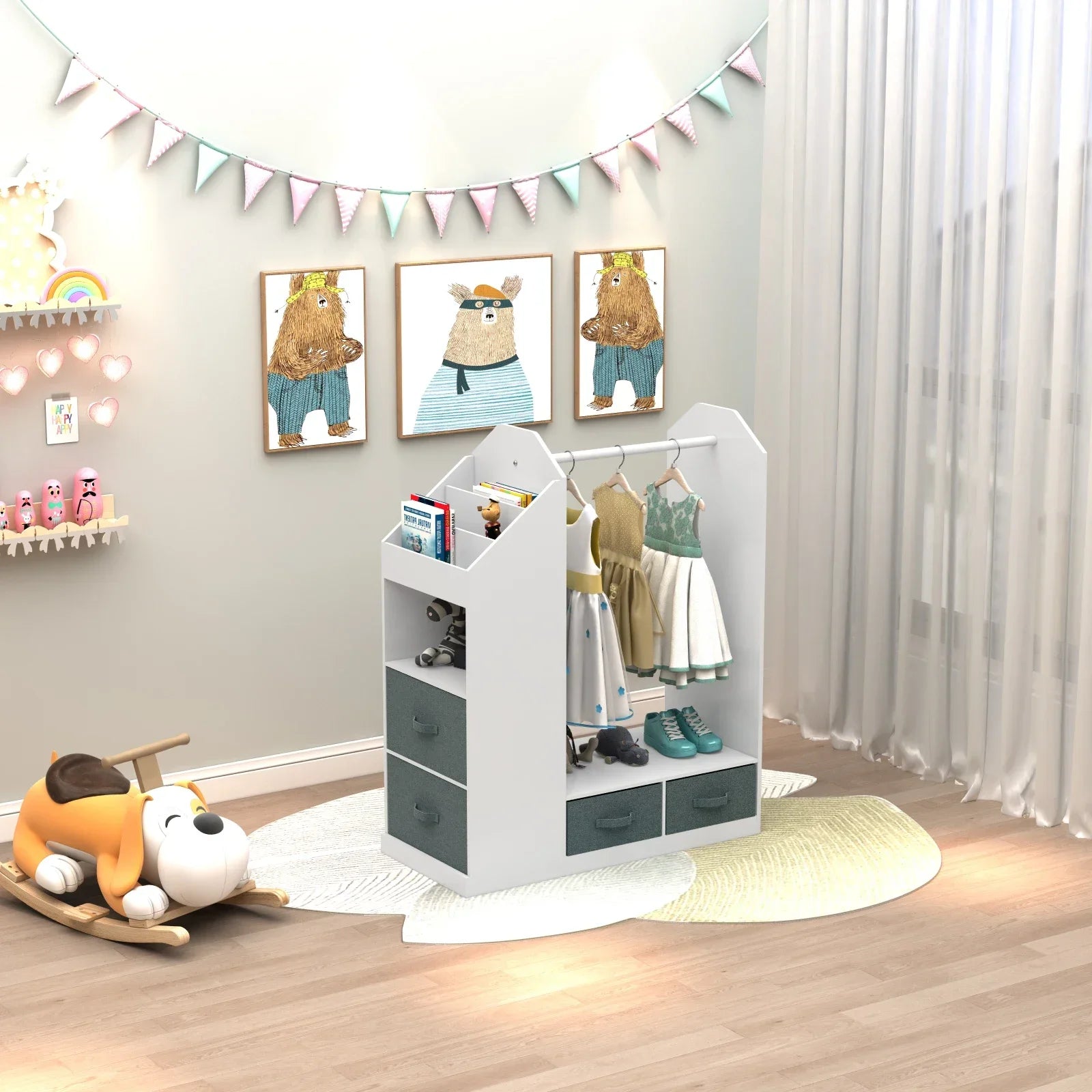 Multi-Functional Storage: Includes a hanging rod, three open shelves, a side hook, and an upper compartment—ideal for organizing clothes, shoes, hats, and dress-up accessories.