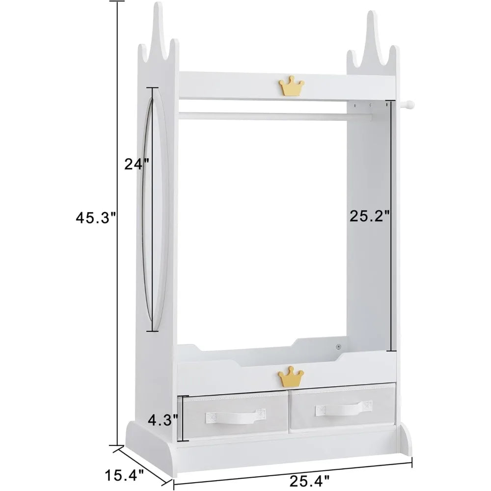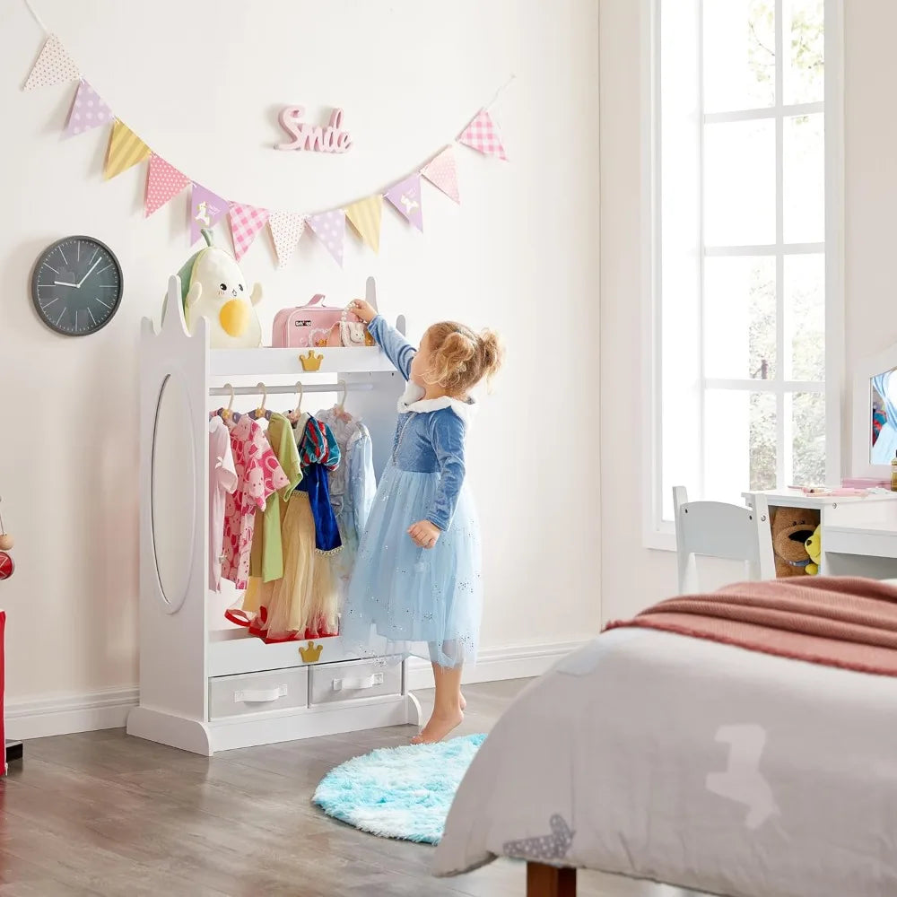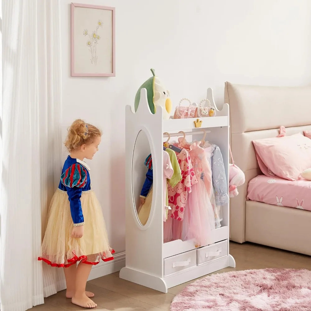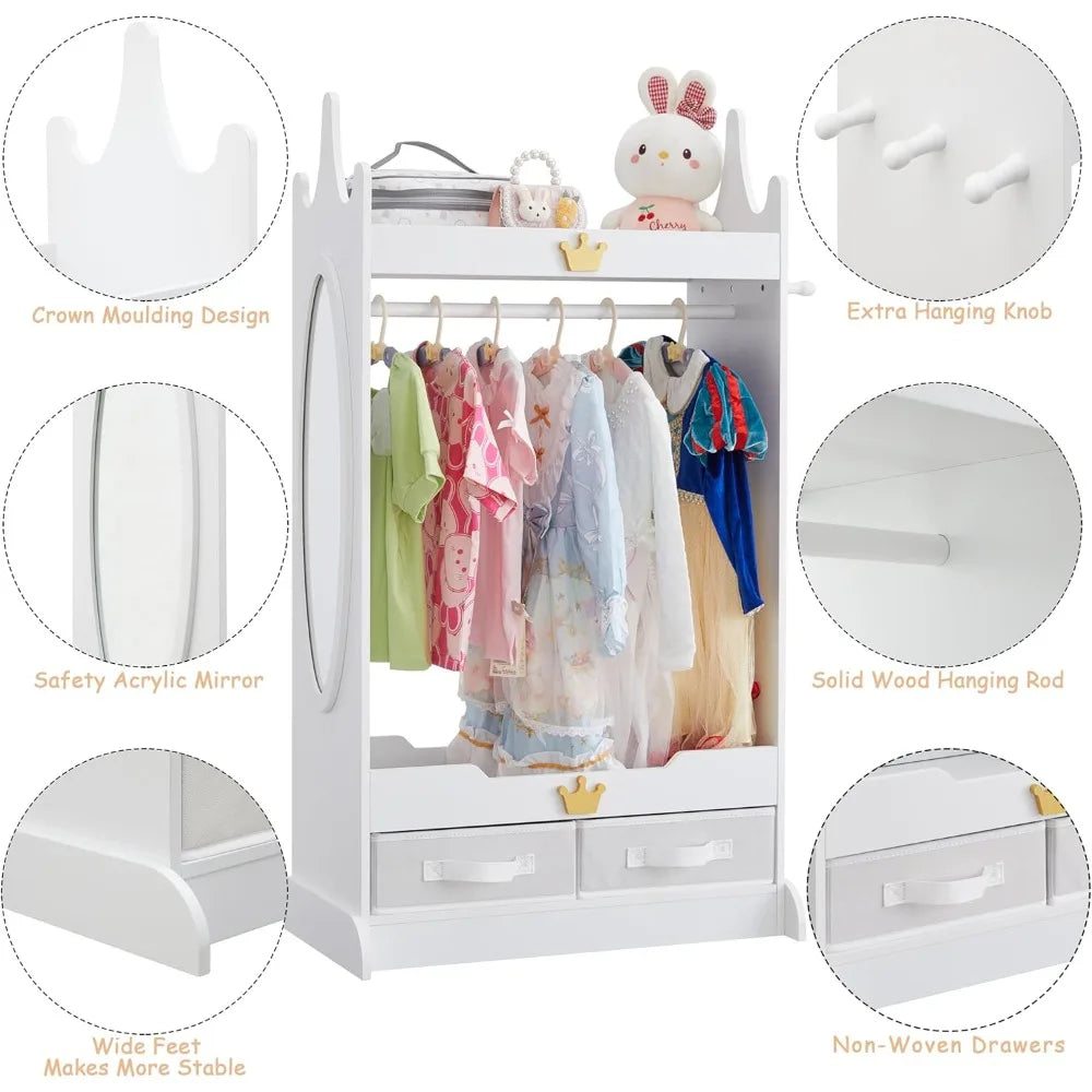 Kids Dress-Up Closet with Mirror – Wooden Armoire with Hanging Rod, Open Shelf & Storage Drawers for Toddlers