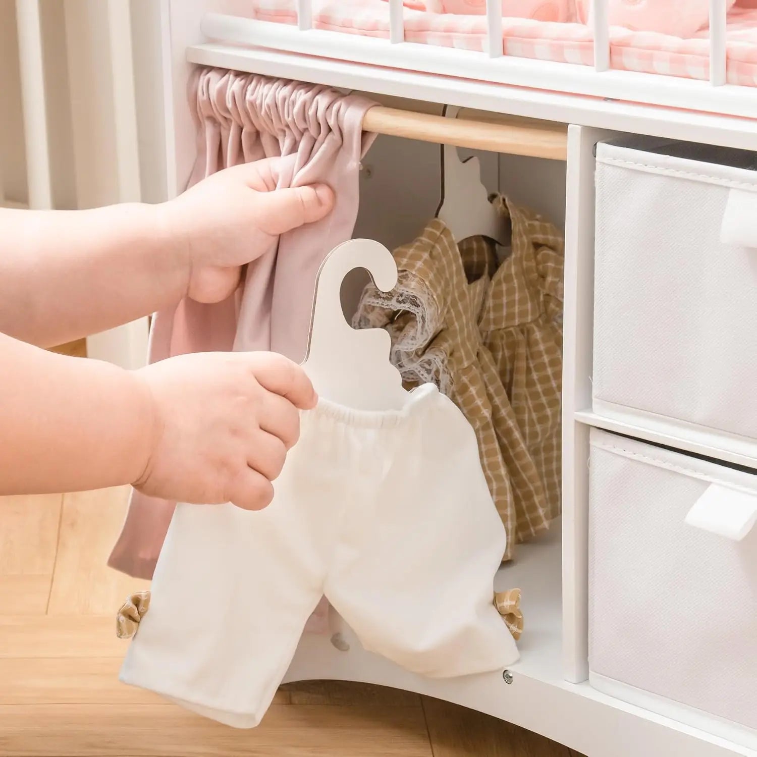 This multi-functional set includes a crib, changing table, and storage space – all in one! Comes with 2 fabric baskets and 3 wooden hooks to neatly store doll clothes, accessories, or tiny toys. Kids will love pretending to care for their baby doll just like real parents do.