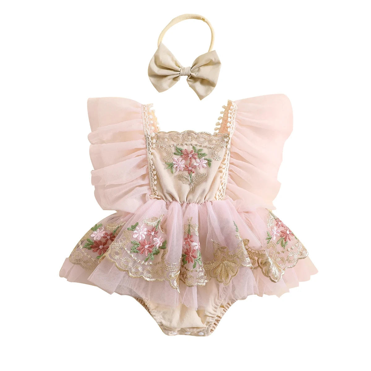 Gorgeous Design: Soft pink romper with floral embroidery, gold lace trim, and airy tulle overlay