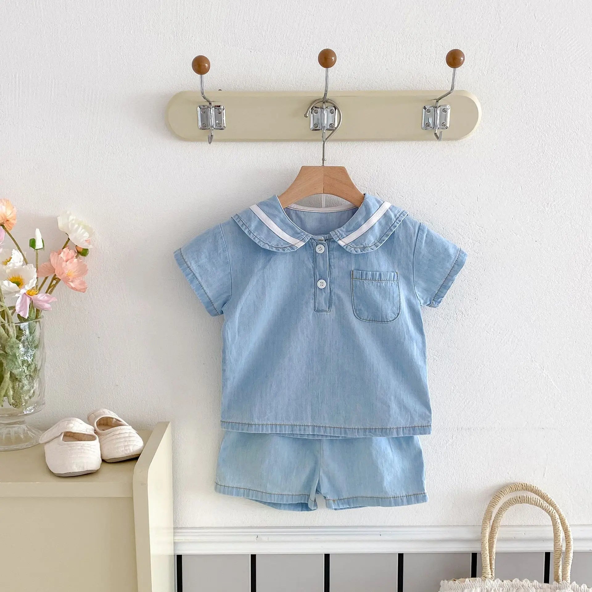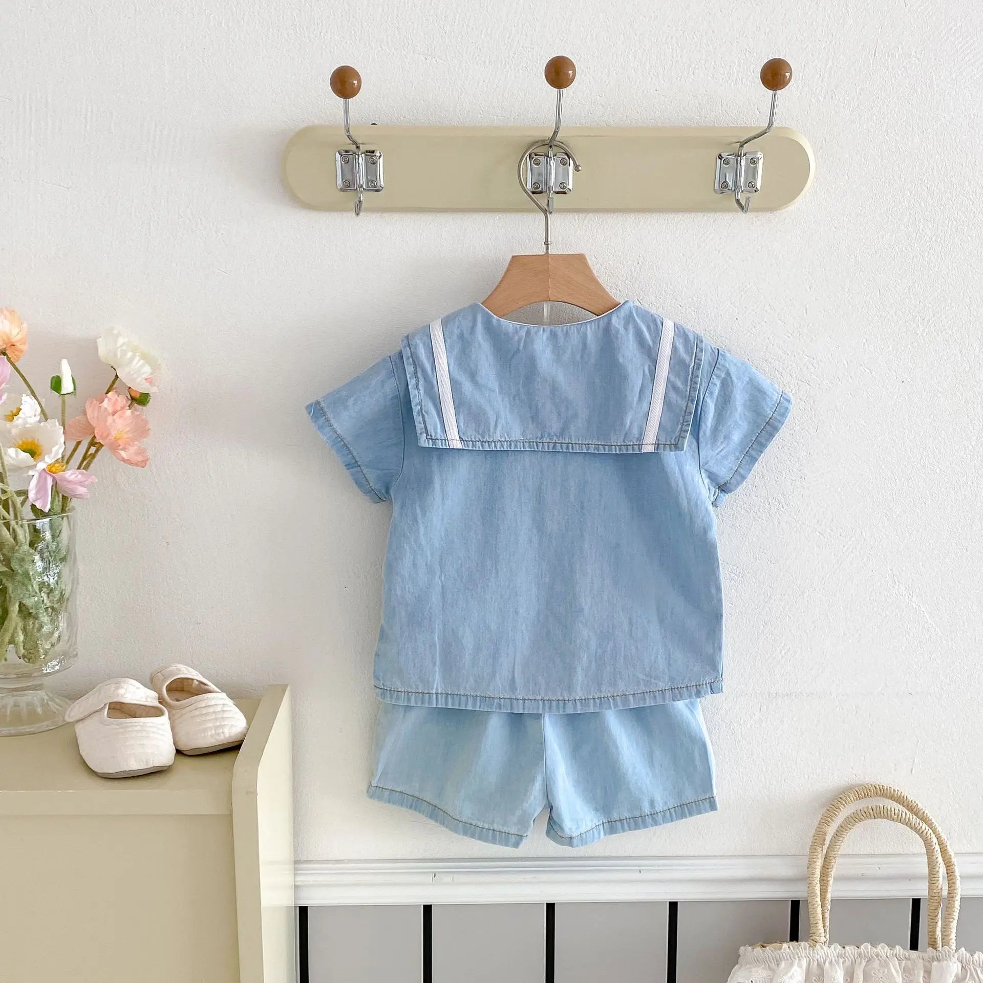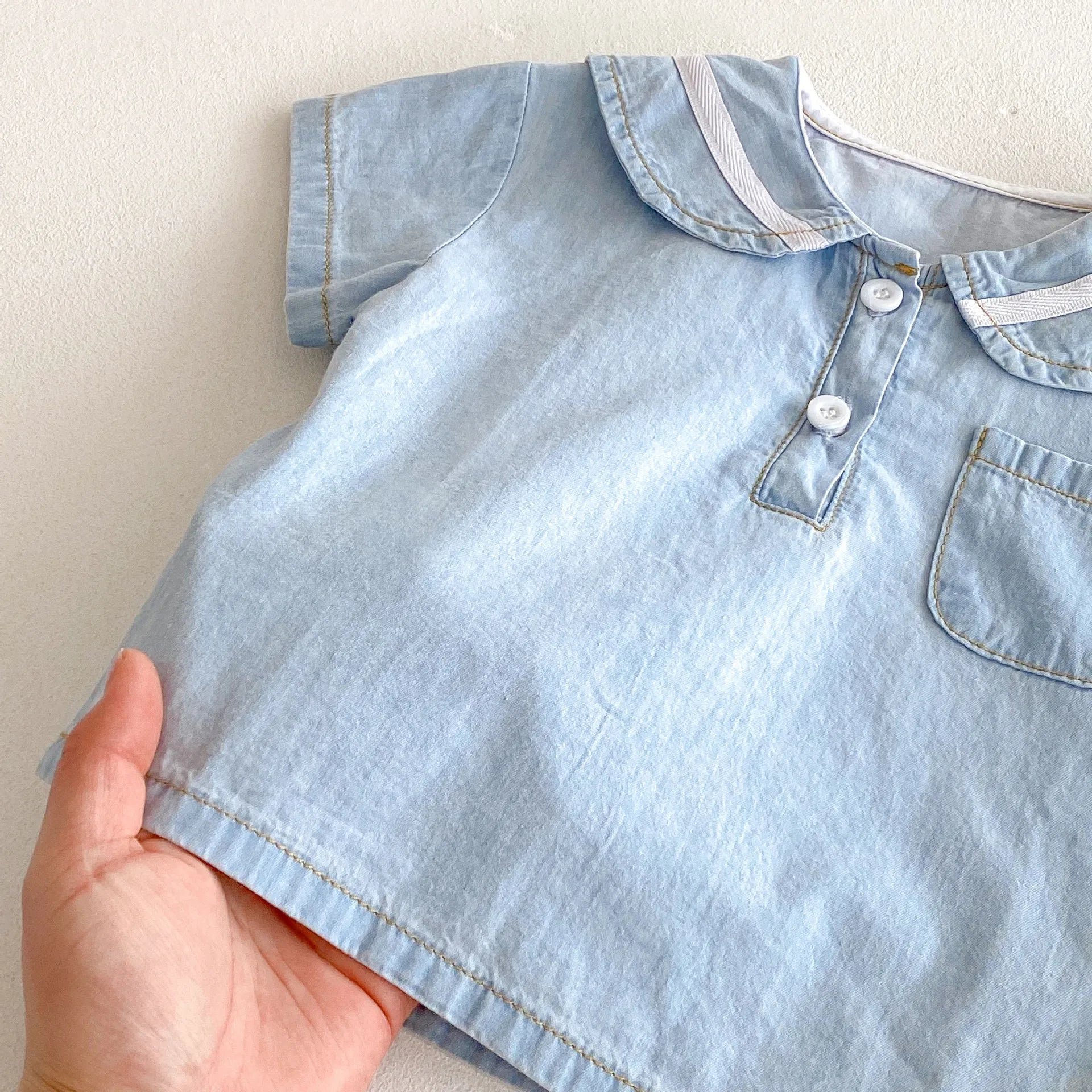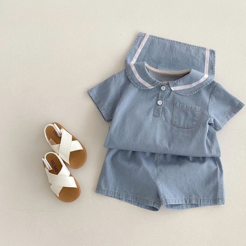 Dress your little one in cool and breathable style this summer! This adorable denim two-piece set includes a sailor-collared shirt and matching shorts—perfect for playdates, strolls, or any sunny-day fun. 🌞