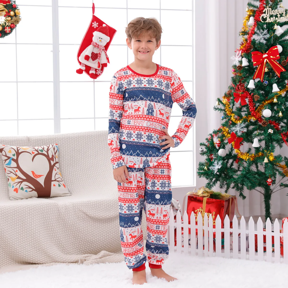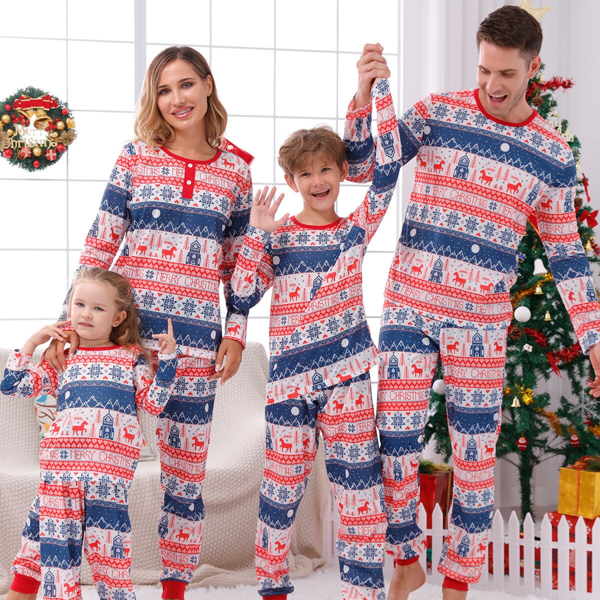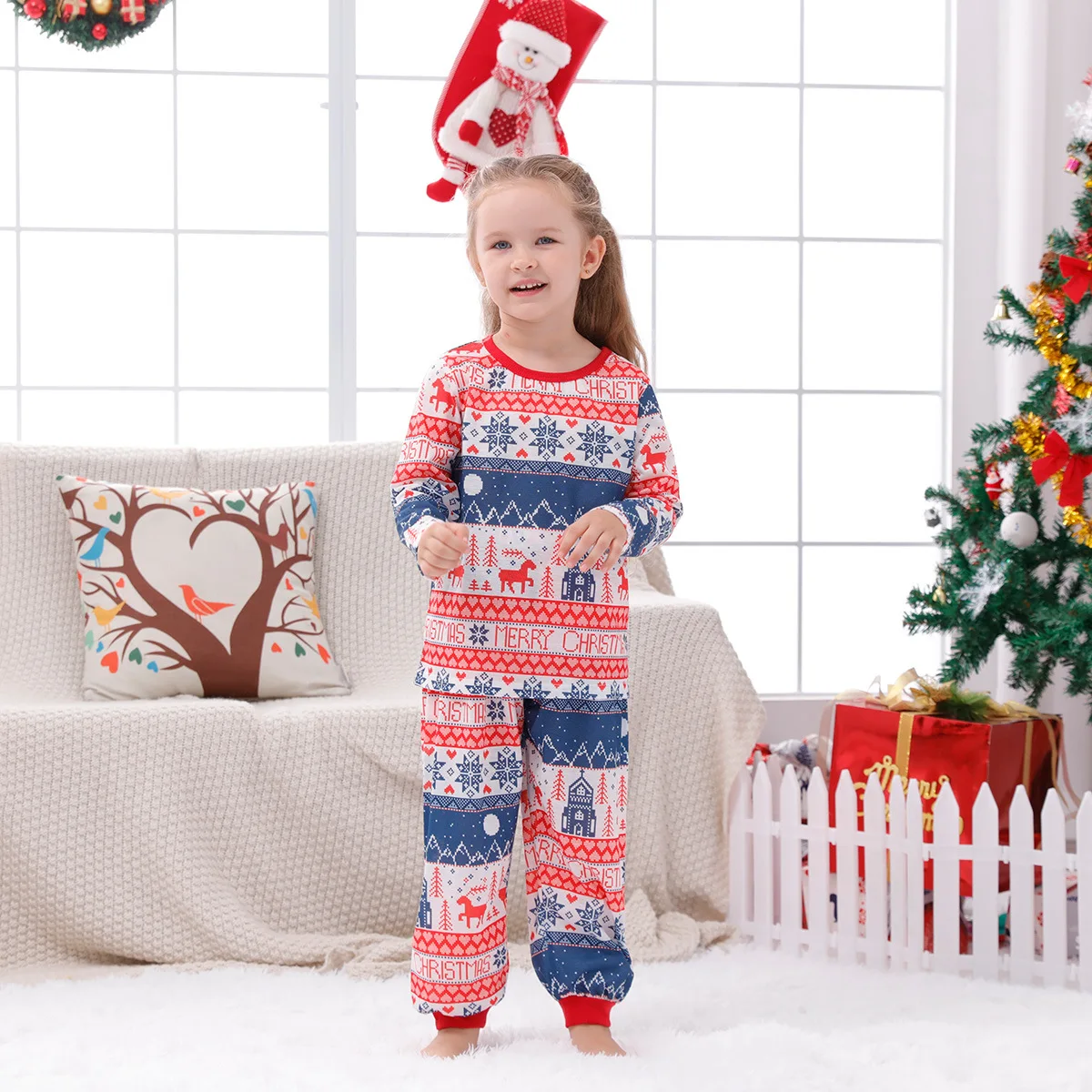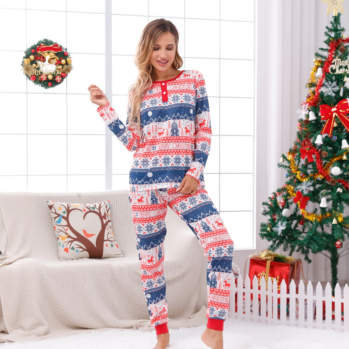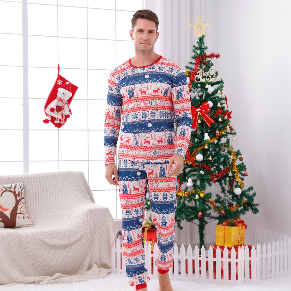 Christmas fashion with unique motifs --- Simple design with a unique Christmas print long-sleeved pullover shirt, combined with trousers to create a lovely new look. These pajamas make all family members charming; You can't miss these amazing clothes.