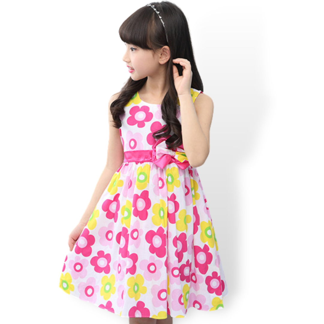 Flower Print Pattern and Bow Belt Design Girl Summer Dress