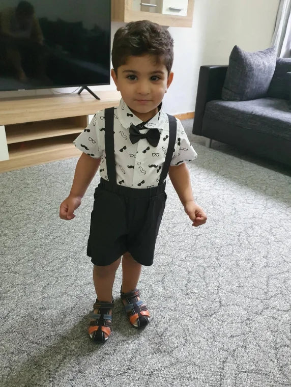 Introducing our Gentleman Baby Costume, a charming ensemble crafted with care and comfort for your precious baby boy. This delightful set includes a dapper bow-adorned bodysuit paired with smart suspender pants, creating the perfect look for weddings, parties, and festivals.