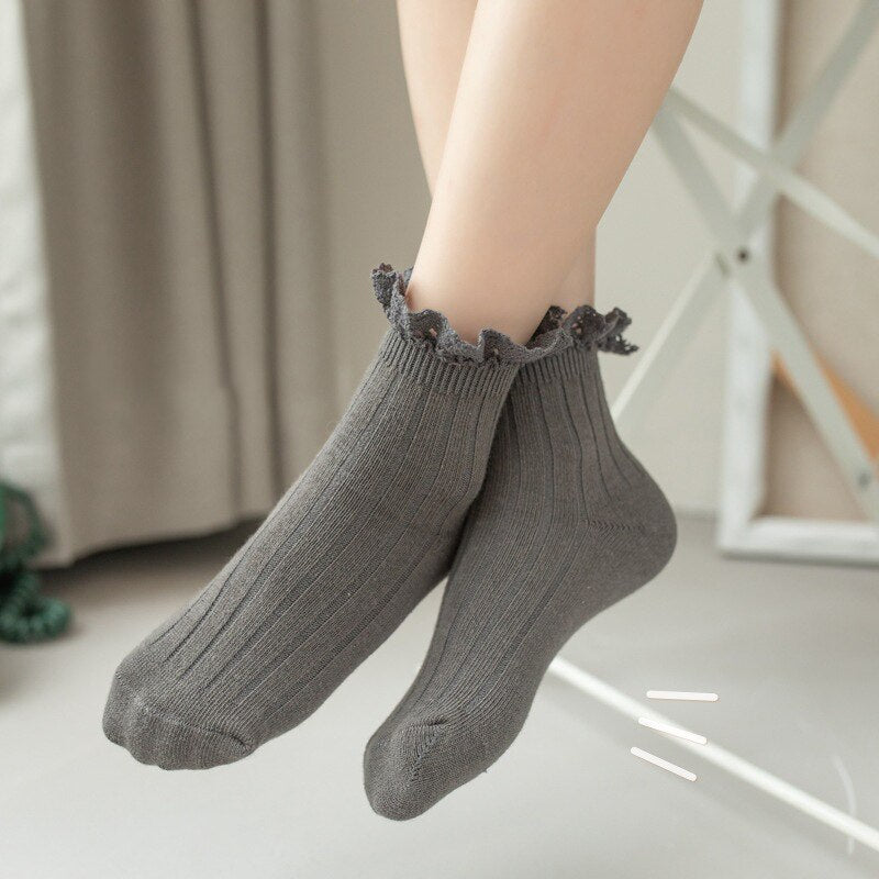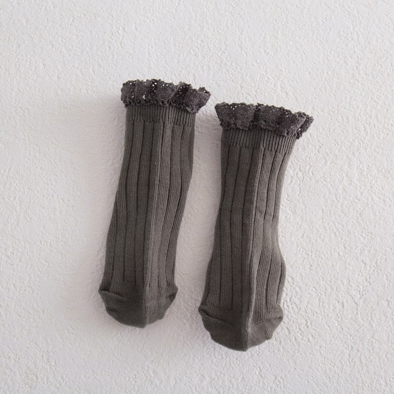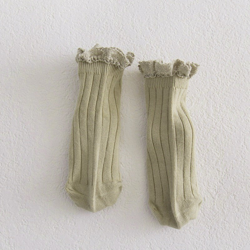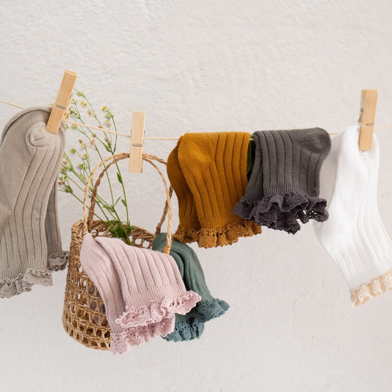Beautiful lace-brimmed cotton socks for girls. Help keep your toddler's feet comfortable in these solid color ruffled lace socks! Baby will love it!