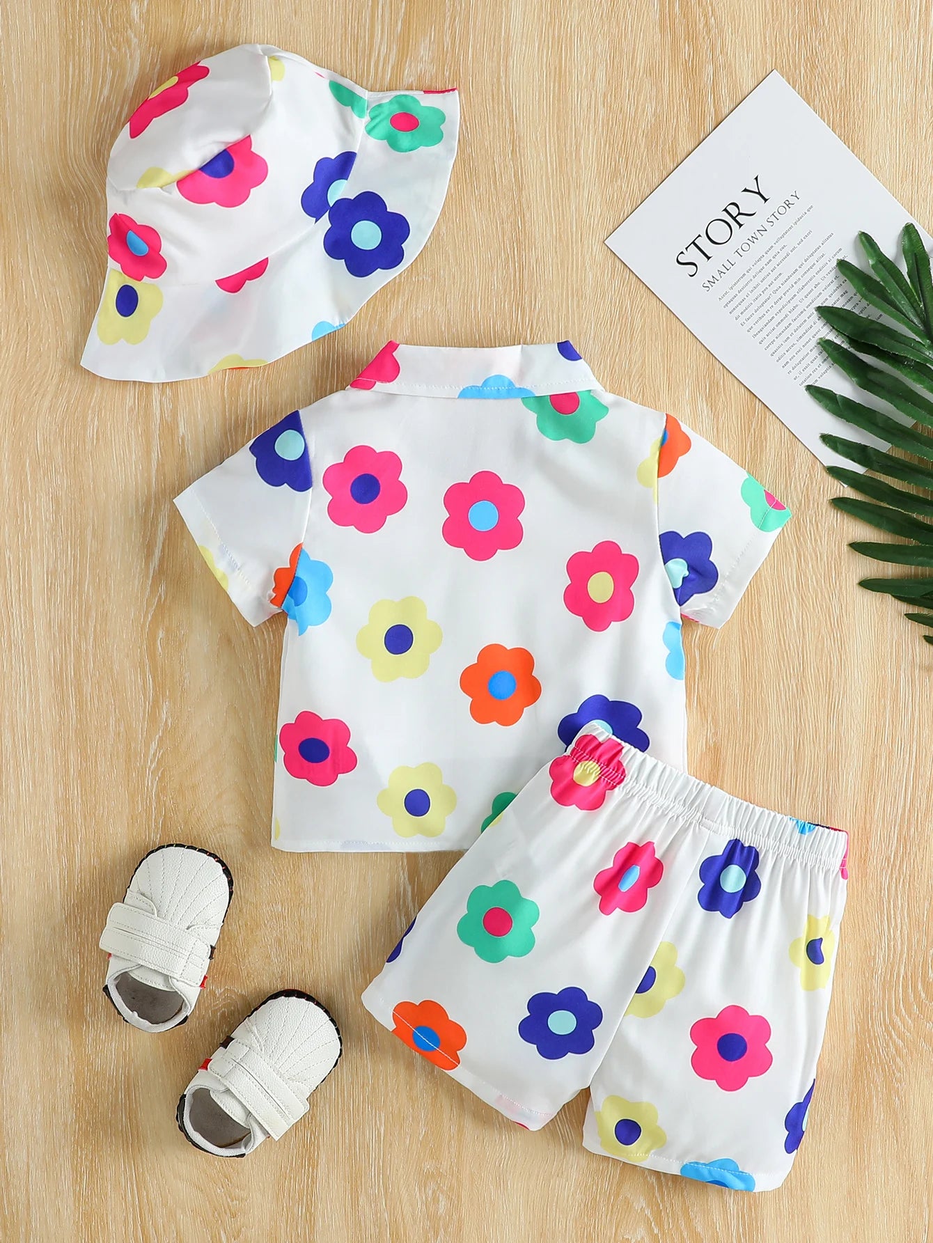 Dress your little sunshine in this vibrant and trendy 3-piece summer outfit! Perfect for both baby boys and girls, this set includes a short-sleeved shirt, elastic-waist shorts, and a matching sun hat to complete the look. Ideal for summer strolls, park days, or photo shoots! πΈβοΈ