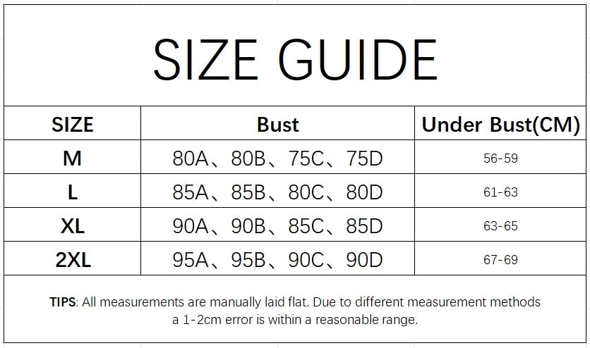 📏 Size Guide (Bust Reference & Under Bust in Inches)
