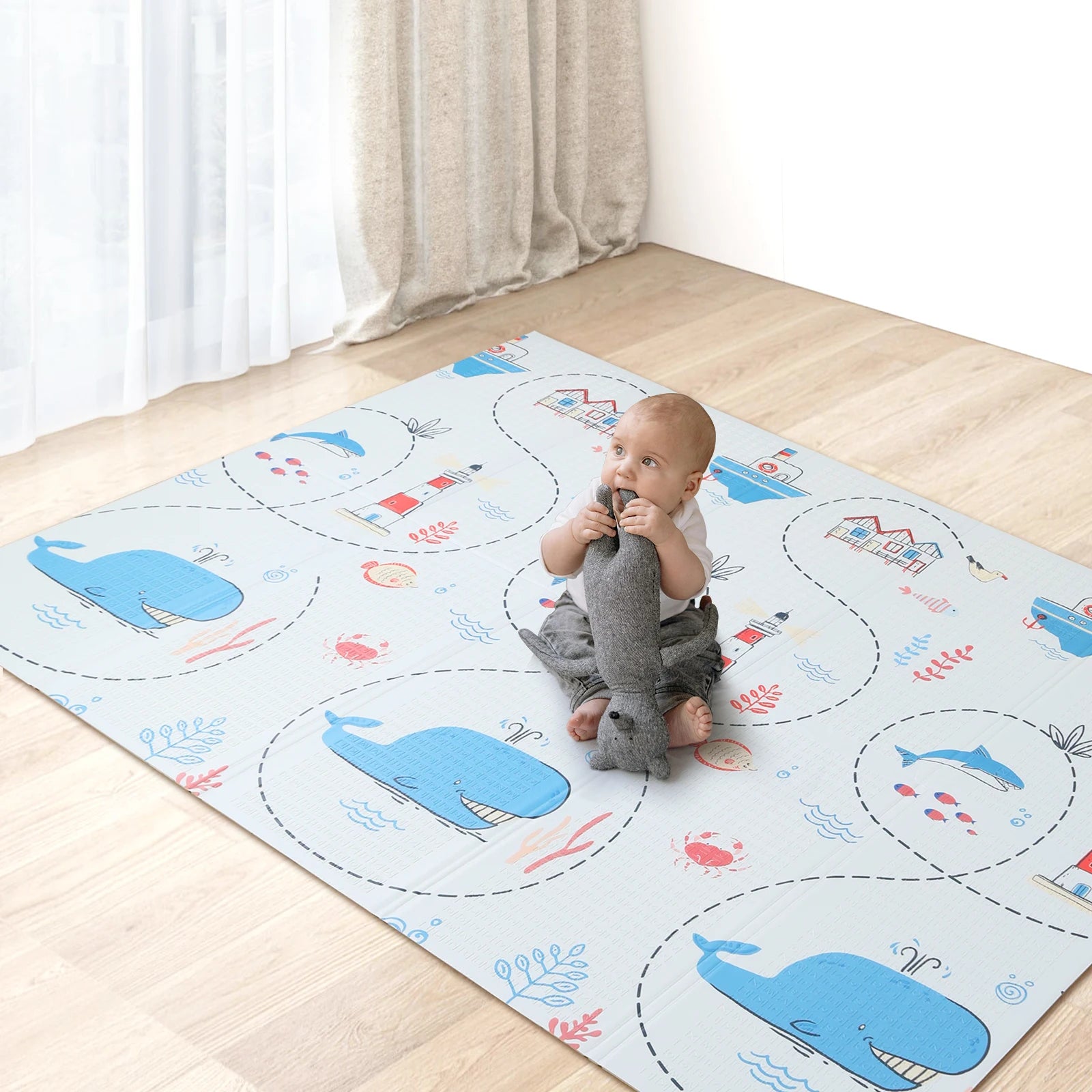 This large, foldable baby play mat is the perfect foundation for your child's playtime, offering superior safety, comfort, and sensory stimulation. Designed with a Double-Sided Design, it provides two visually stimulating and educational patterns that seamlessly blend into any home decor.