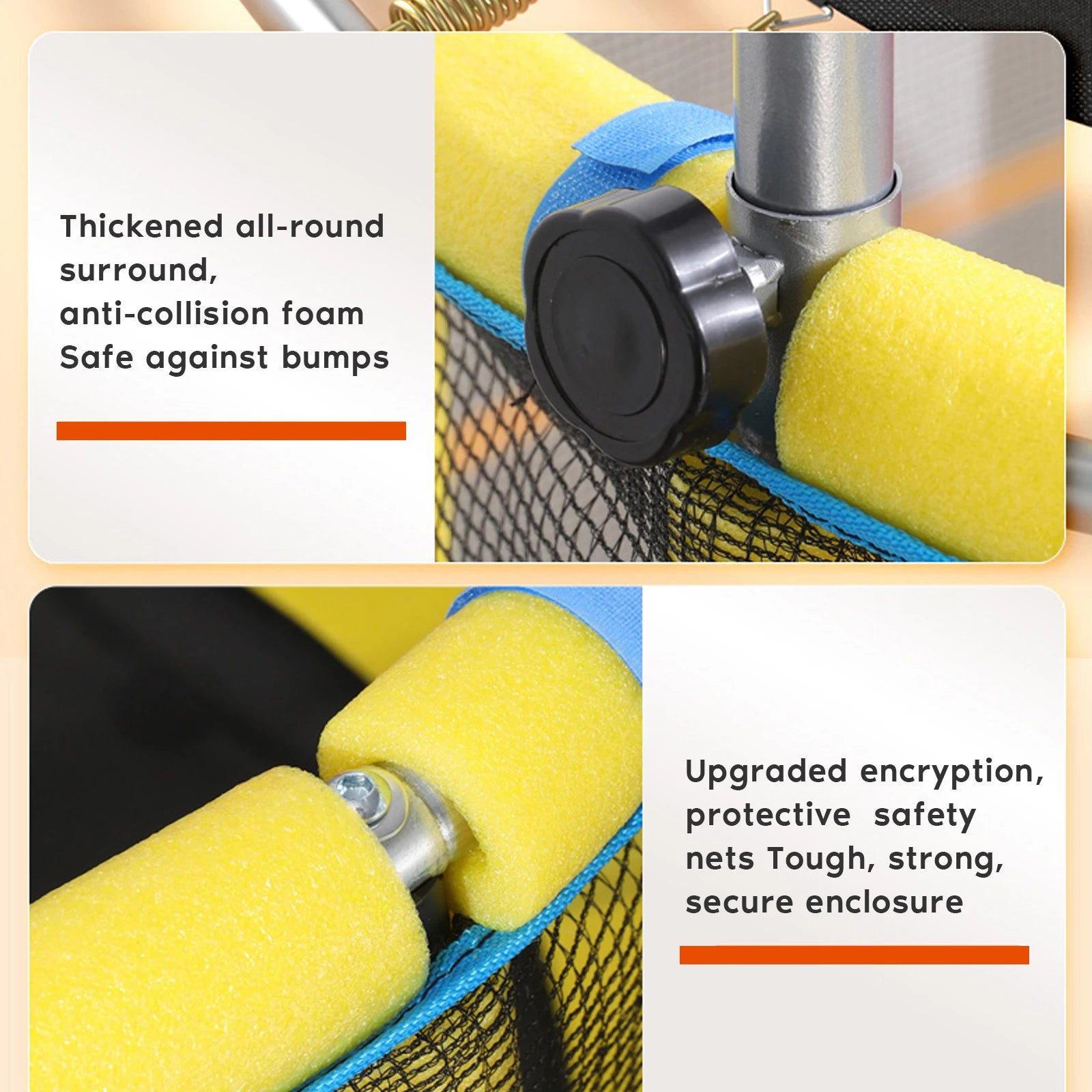 Your child’s safety comes first. The trampoline features an upgraded safety enclosure net, thickened anti-collision foam, and a no-gap design that prevents little feet from slipping through. The high-elastic jumping mat ensures a soft and secure bounce.