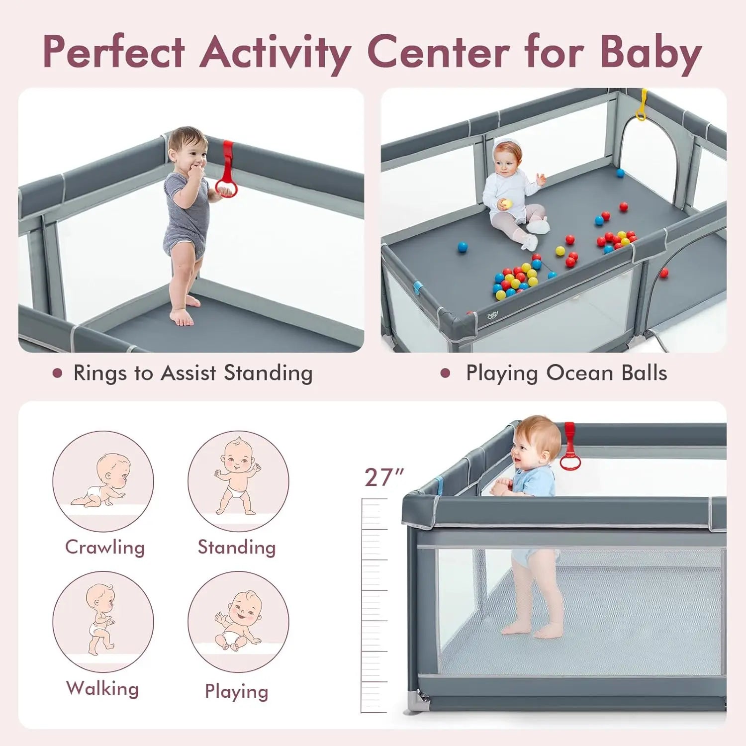 Includes 50 colorful ocean balls to boost fun and sensory engagement. The 27” high walls and 4 built-in hand grips help support toddlers as they learn to stand and walk—ideal for encouraging motor development.