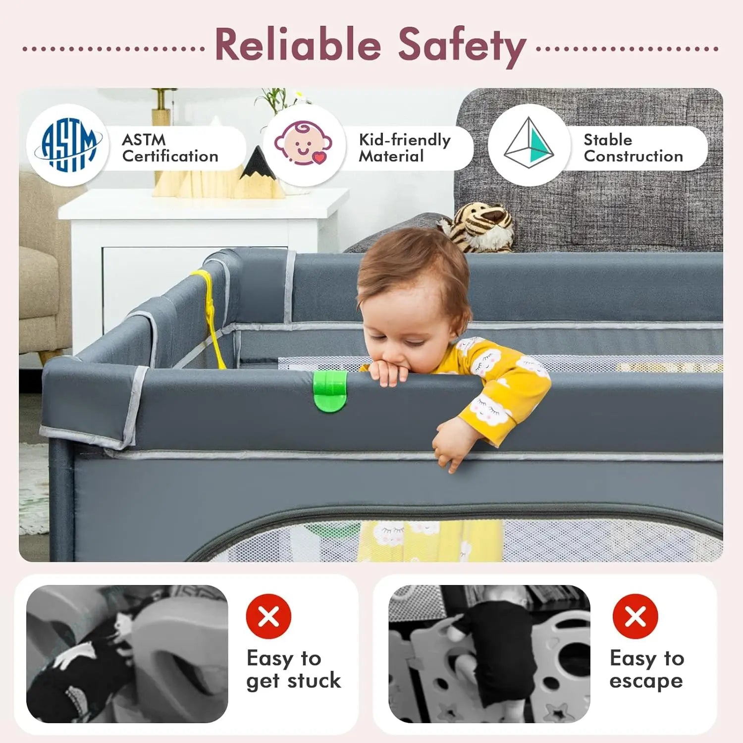 Constructed from double-thickened waterproof 210D Oxford fabric, safe and breathable for your baby’s skin. The internal frame is fully wrapped to prevent injuries, and non-slip suction cups keep the playpen securely in place, even on smooth floors. -