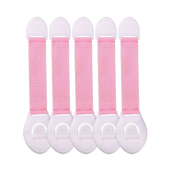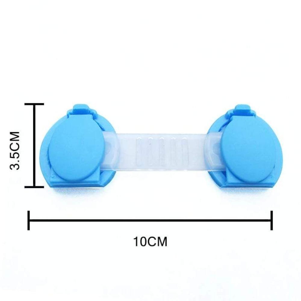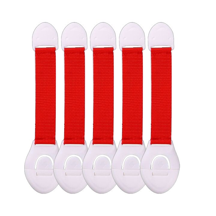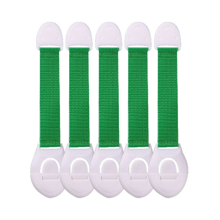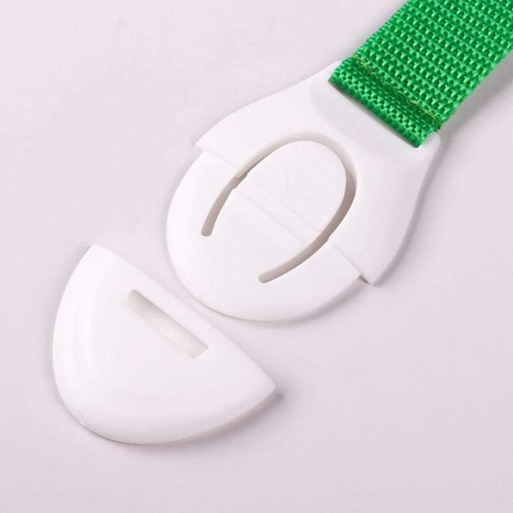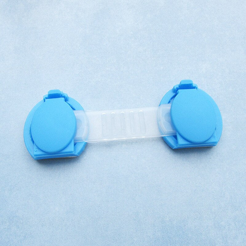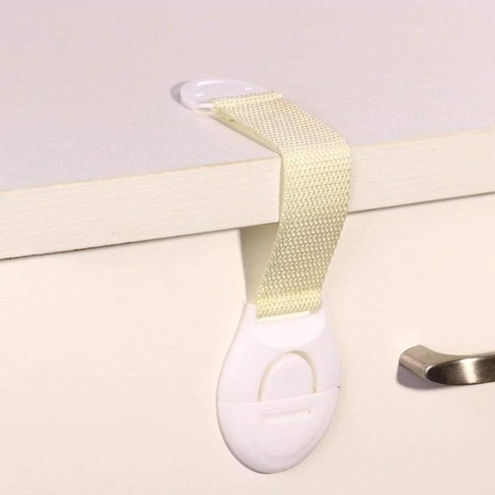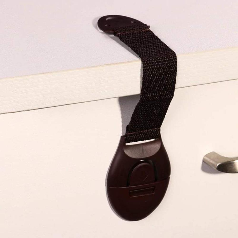 - Latches have a novel and unique appearance and do not affect the beauty of your furniture. It is made of ABS material. The fixed end is designed to rotate 360° so that the safety buckle will automatically slide down after opening. A flexible strap allows latching around corners. Our child protection lock uses strong adhesive on the back. In this way, you no longer need to worry about the safety fridge lock falling off.
