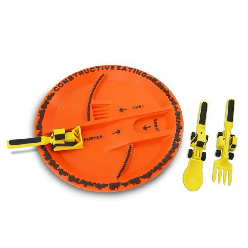 The playful design features utensils modeled after construction vehicles, with a fork as an excavator, a spoon as a loader, and a knife as a bulldozer, all perfectly sized for small hands. The round dinner plate is cleverly crafted to resemble a construction site with roads, inviting imaginative play and interaction with every bite.