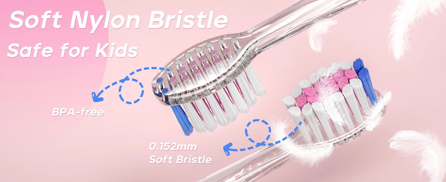 Soft Bristles for Gentle Cleaning: The toothbrush head is equipped with soft bristles made from silicone, ensuring gentle cleaning that protects your child's tooth enamel. The handles are crafted from food-safe ABS and TPE materials, guaranteeing safety and durability.