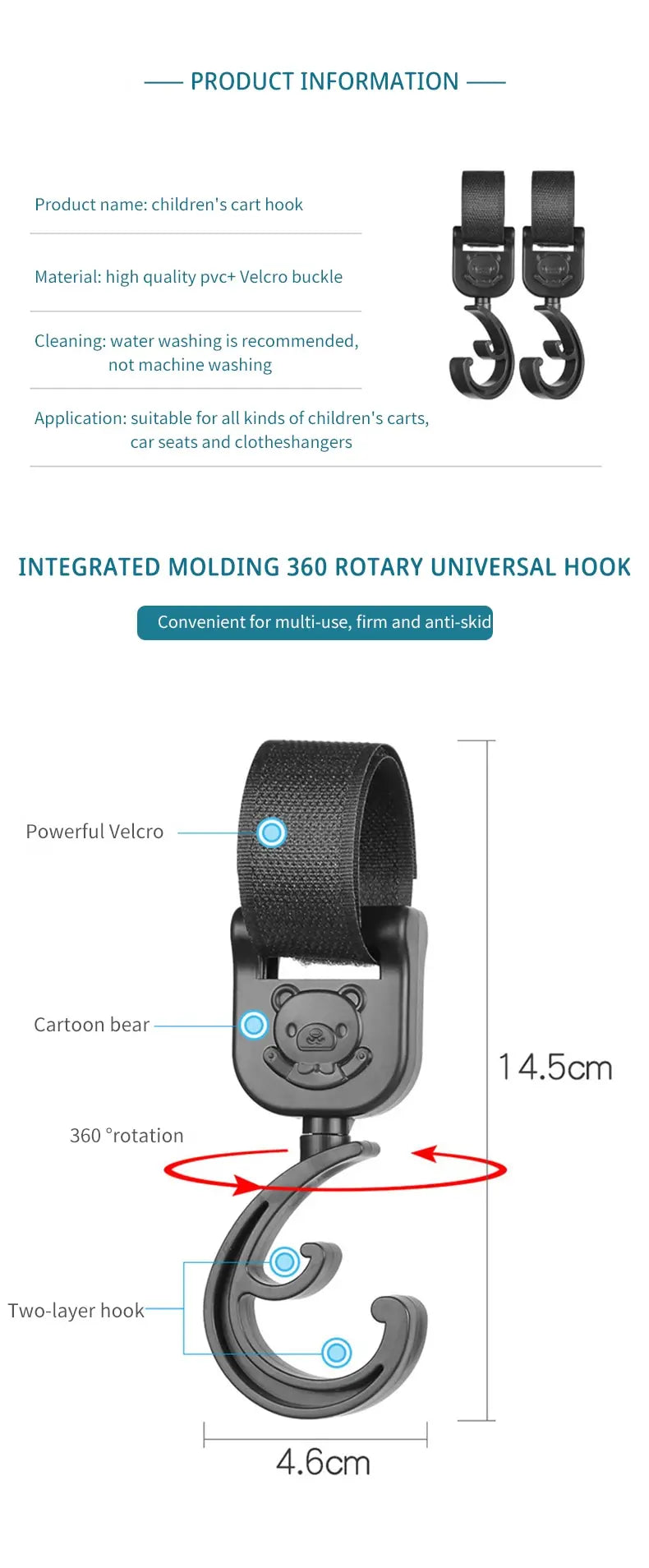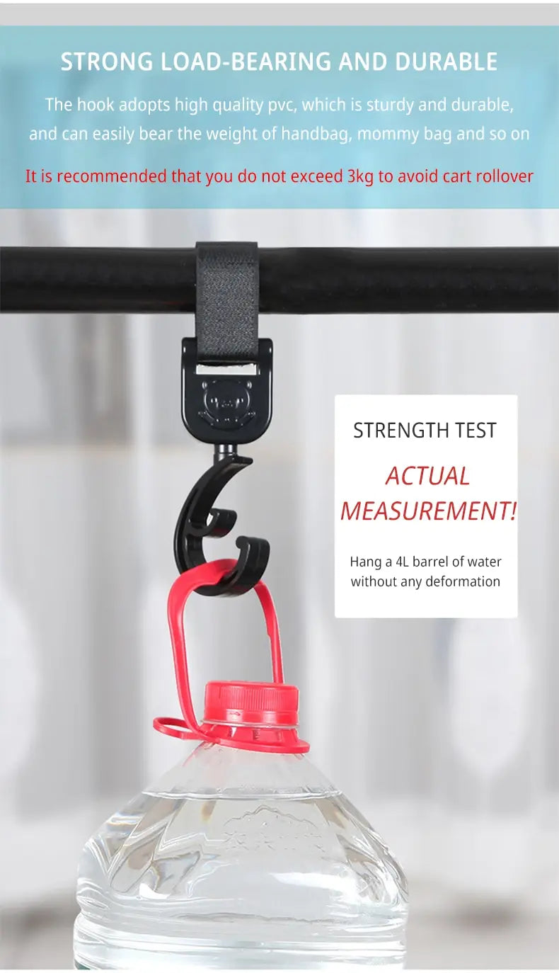 360-Degree Rotation: With a 360-degree rotation capability, our stroller hook offers easy access to the items hung on it from any angle.