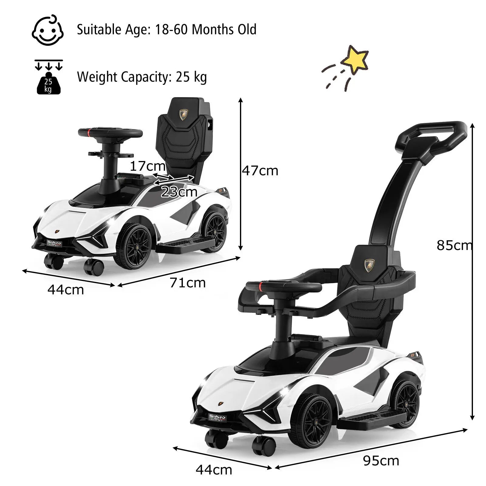 This licensed Lamborghini car is the perfect toy for active toddlers, seamlessly converting to support different stages of development (18–60 months old). Its cool, realistic appearance and multi-functional design ensure endless fun while promoting exercise and safety.