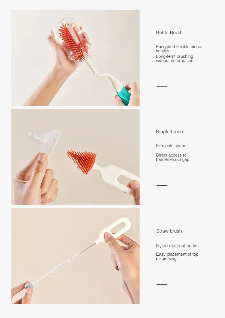 - 360° Rotation Cleaning: Our silicone brush set features a groundbreaking design that allows a full 360° rotation, reaching every corner and curvature of baby bottles with ease.