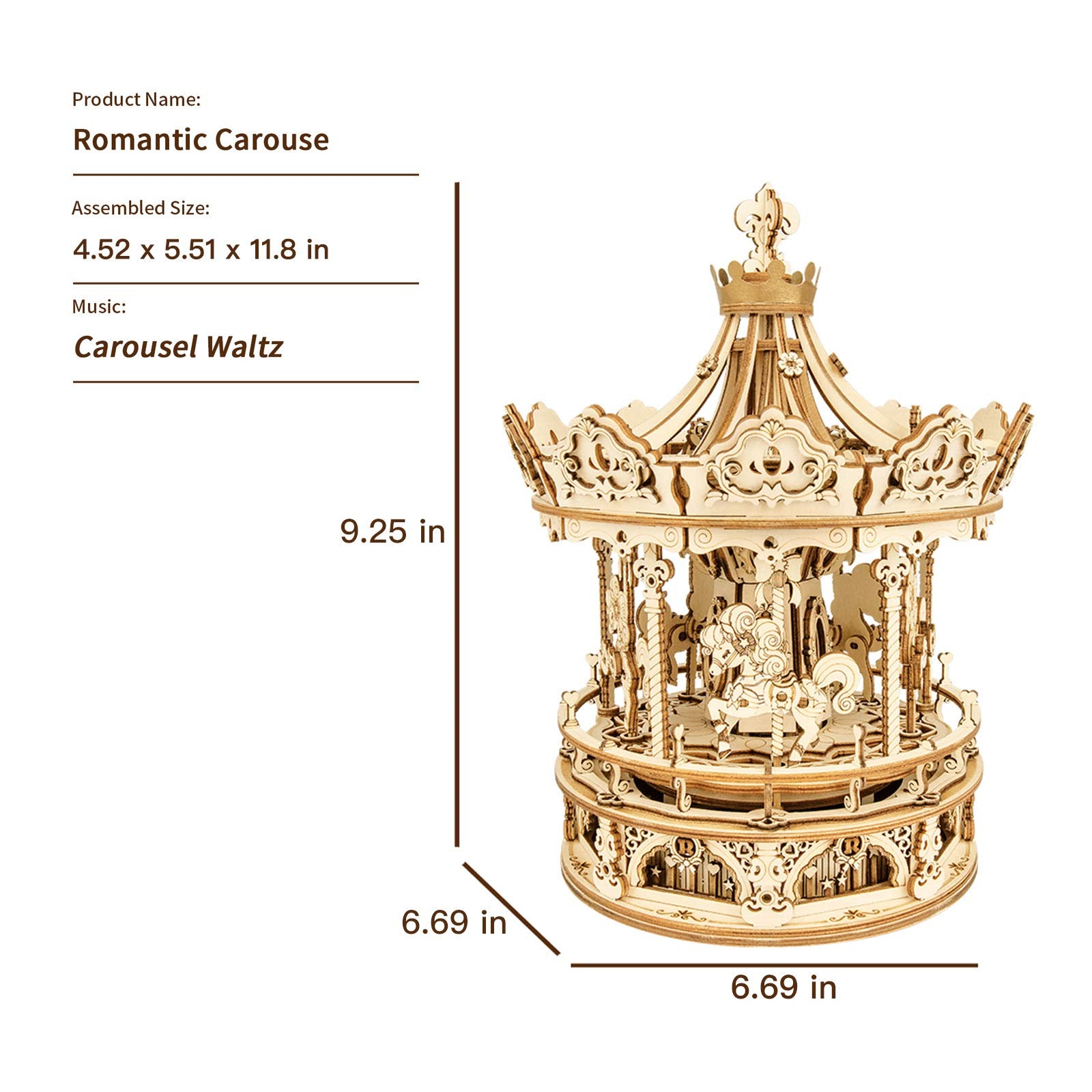 Romantic Carousel Mechanical 3D Wooden Puzzle Music Box. It is a mechanical merry-go-round DIY music box 3D wooden puzzle. It represents a real merry-go-round mechanism. With romantic decoration and tune, you will get lots of fun during and after building it.