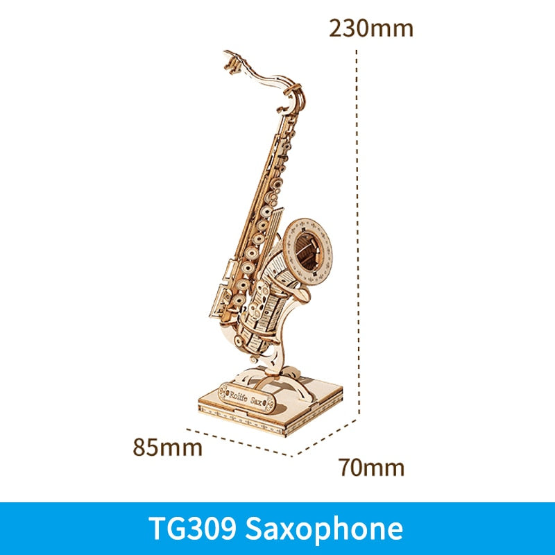 - Saxophone: Assembled size: 85x70x230mm, Wood Pieces: 136pcs, Assembly time: 1.5 hours