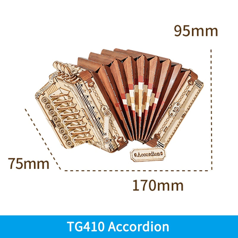 - Accordion: Assembled size: 170x75x95mm, Wood Pieces: 152pcs, Assembly time: 1.5 hours