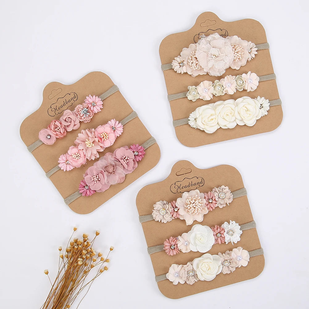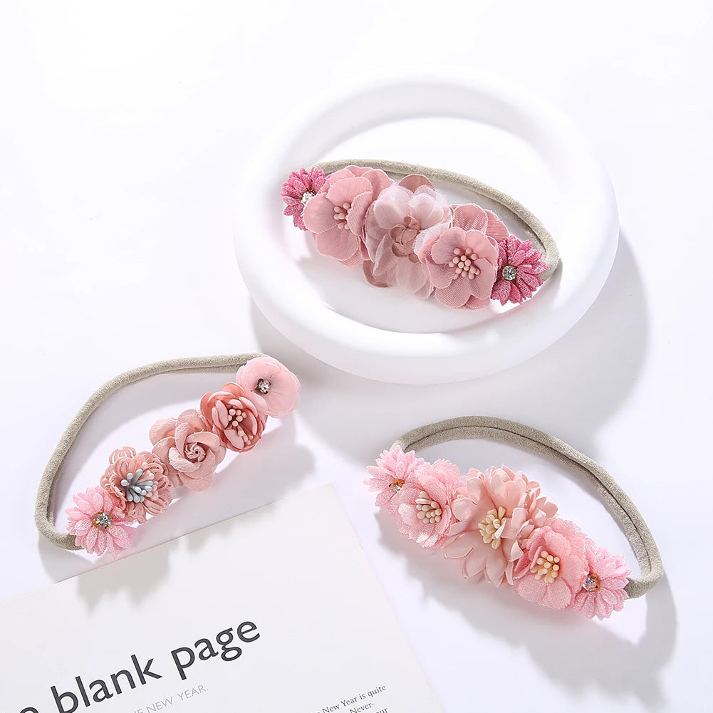 3Pcs/Set Artificial Flower Baby Headbands Girls Rhinestone Nylon Hair Bands Kids Mini Ins Photography Props Kids Fashion Headwear