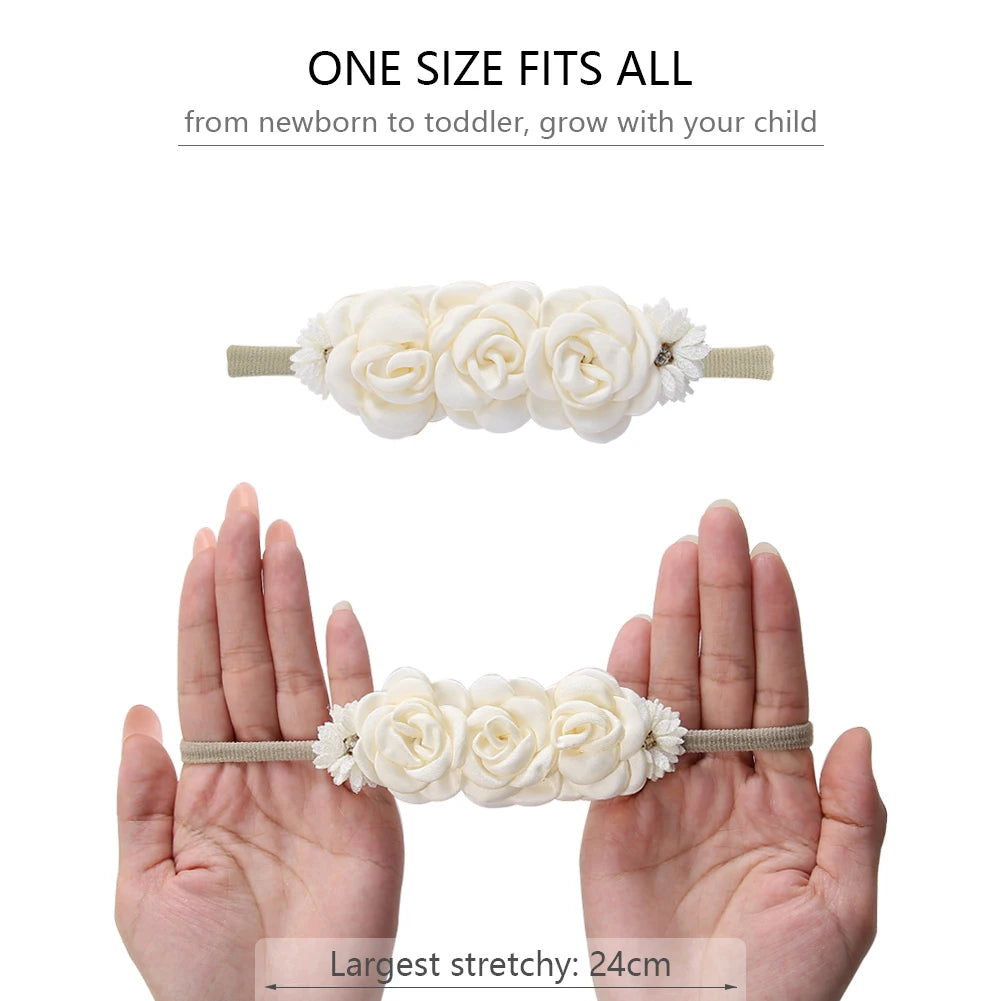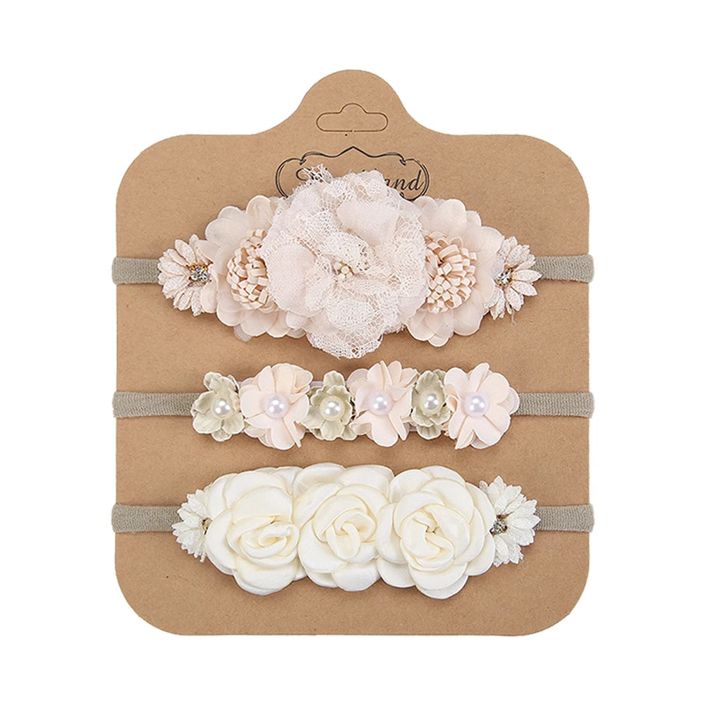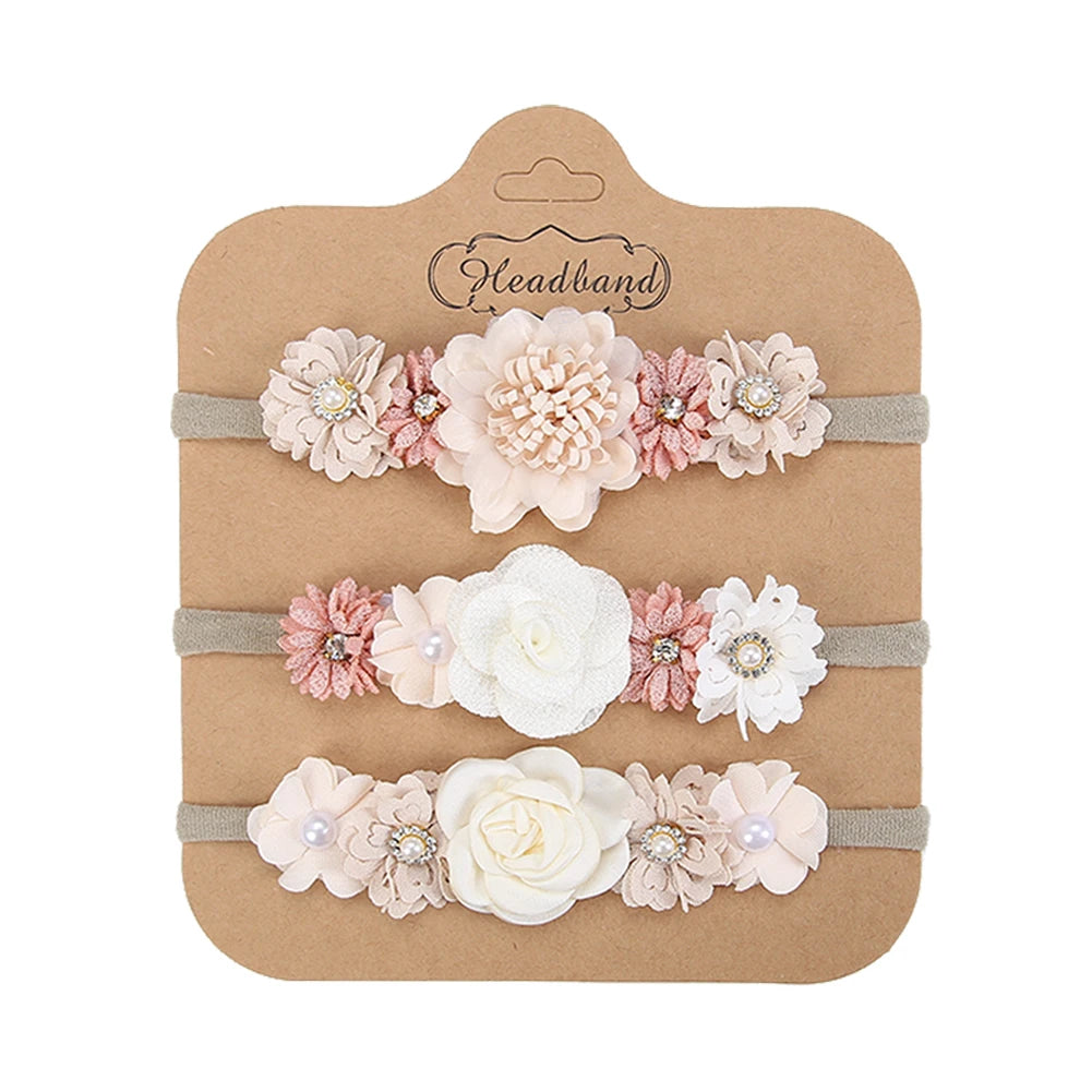 Each set includes 3 beautifully crafted headbands adorned with fabric flowers, pearls, and sparkling rhinestones for a soft, elegant look.
