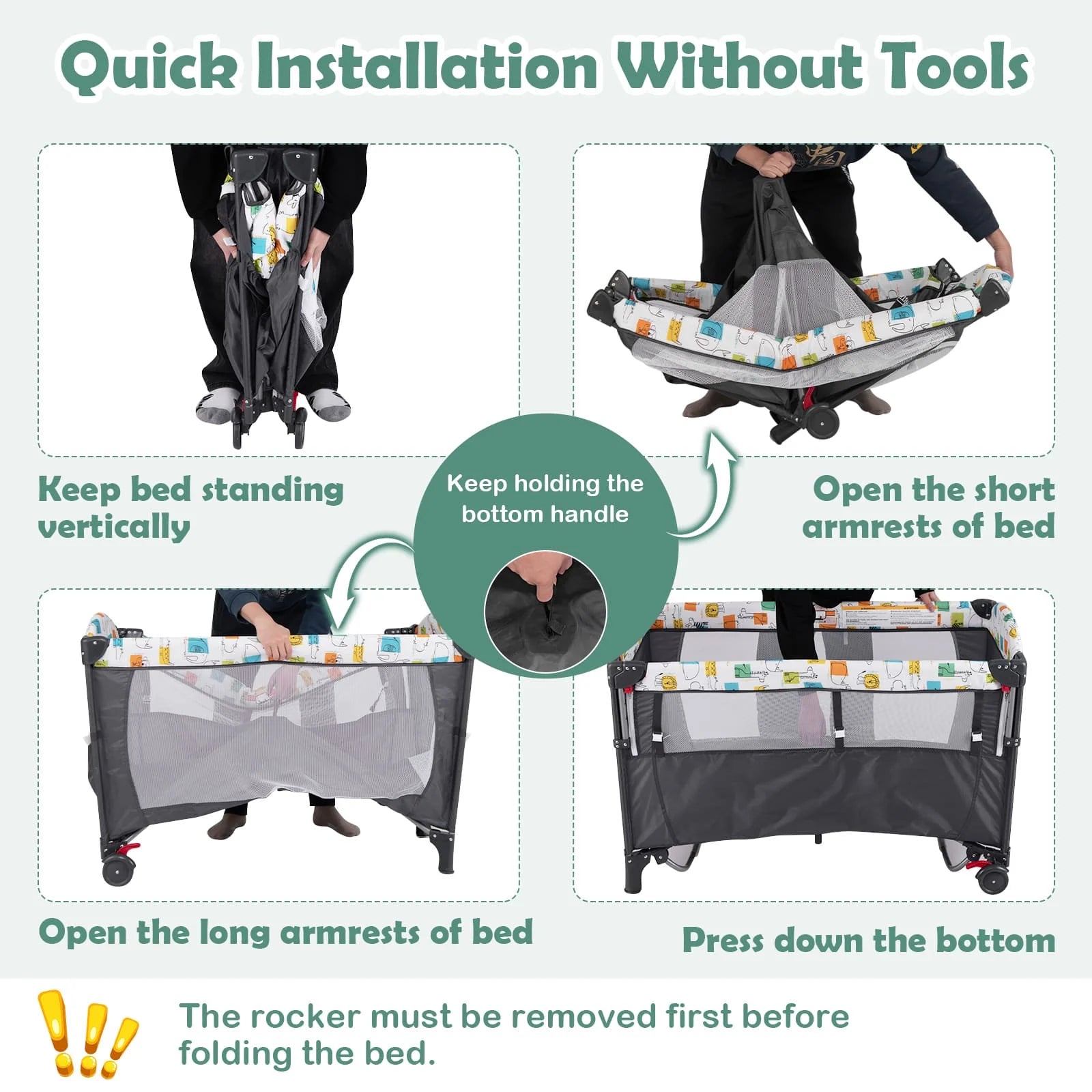 5-in-1 Multi-Function Design: Easily converts between five essential modes: Bedside Sleeper, Crib, Cradle, Changing Table, and Baby Playpen (with zippered door).