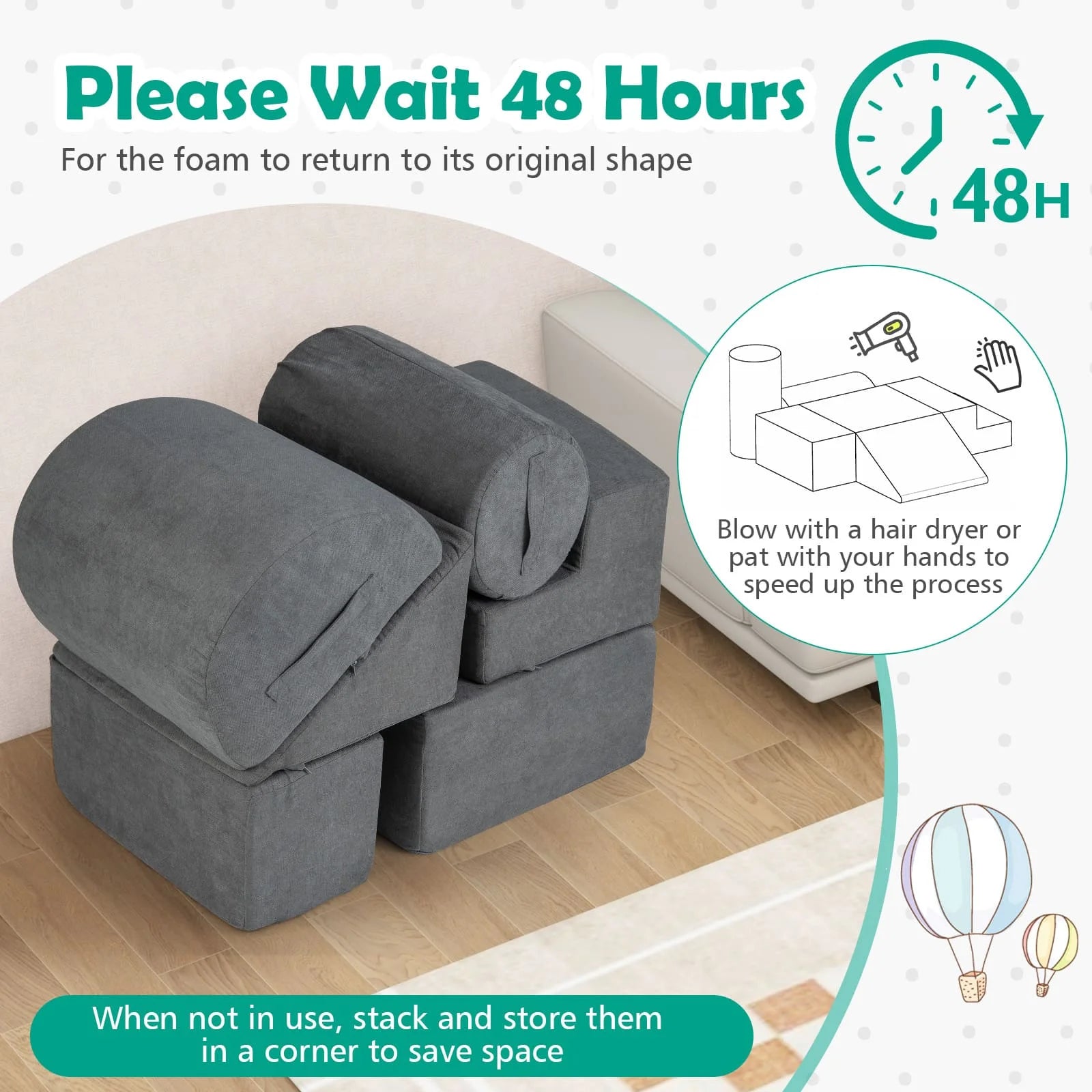 Easy Storage: When not in use, the modular pieces can be stacked and stored neatly in a corner to save space.