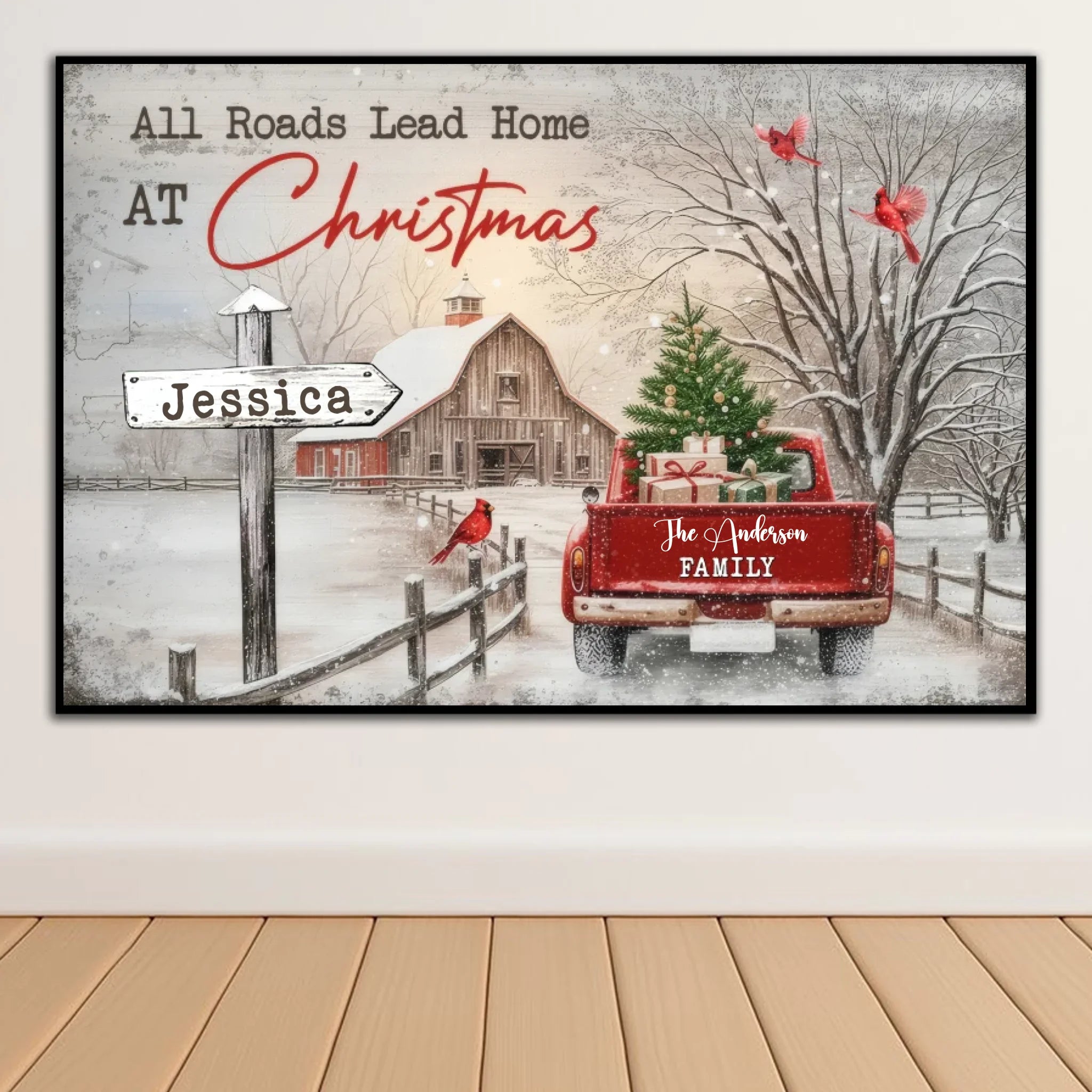 Bring the warmth of the holiday season into your home with this “All Roads Lead Home at Christmas” Personalized Poster. Featuring a cozy winter farmhouse scene, a classic red truck, and customizable family name signage, this artwork adds a heartfelt touch to your festive décor. Perfect for living rooms, entryways, or as a meaningful Christmas gift for loved ones.