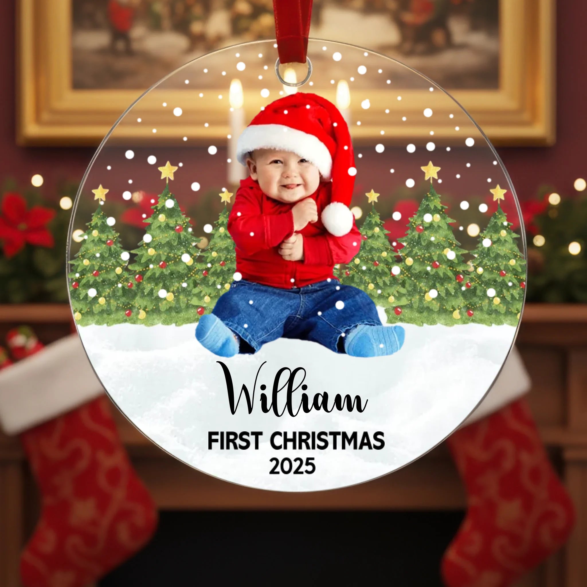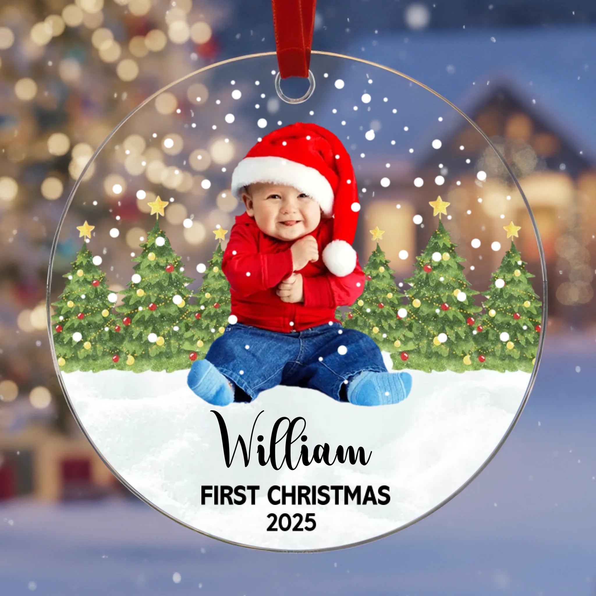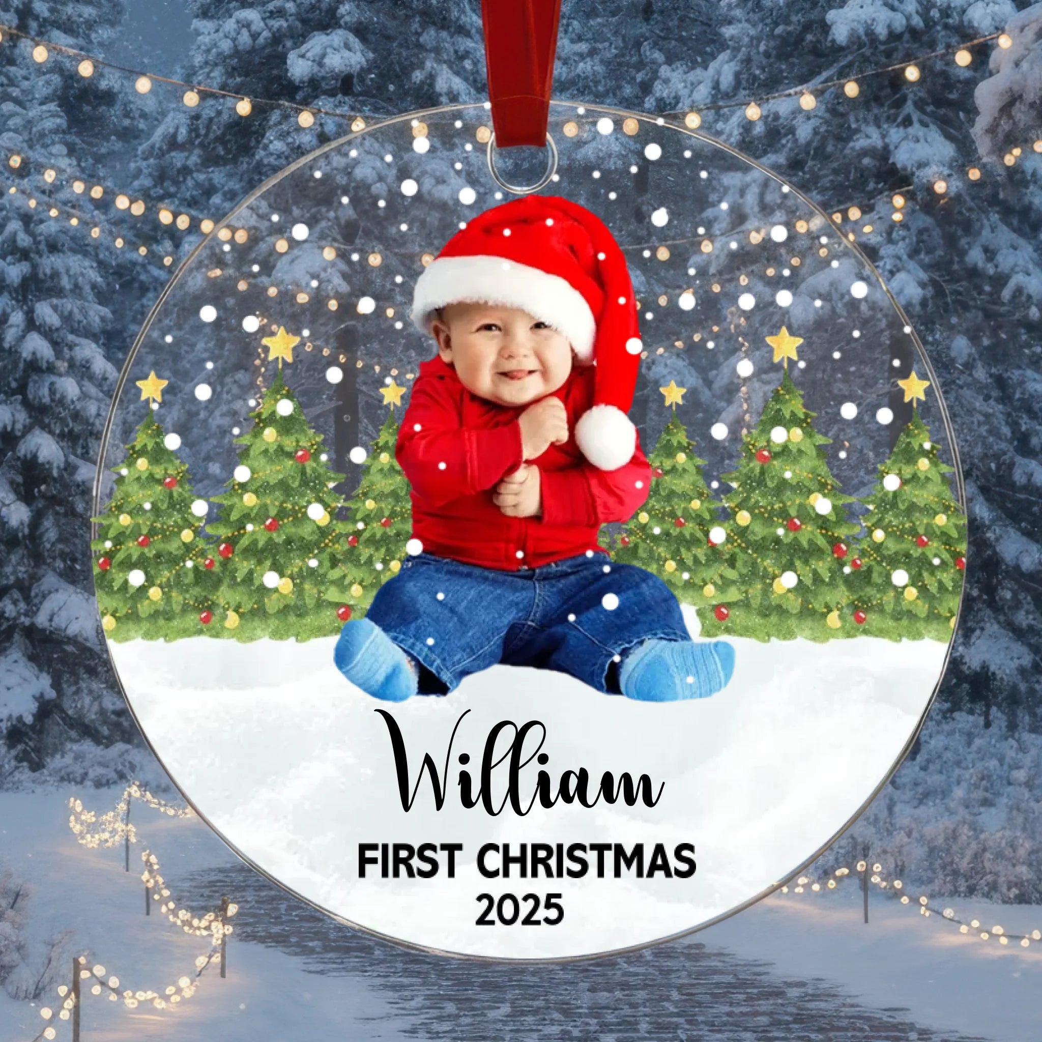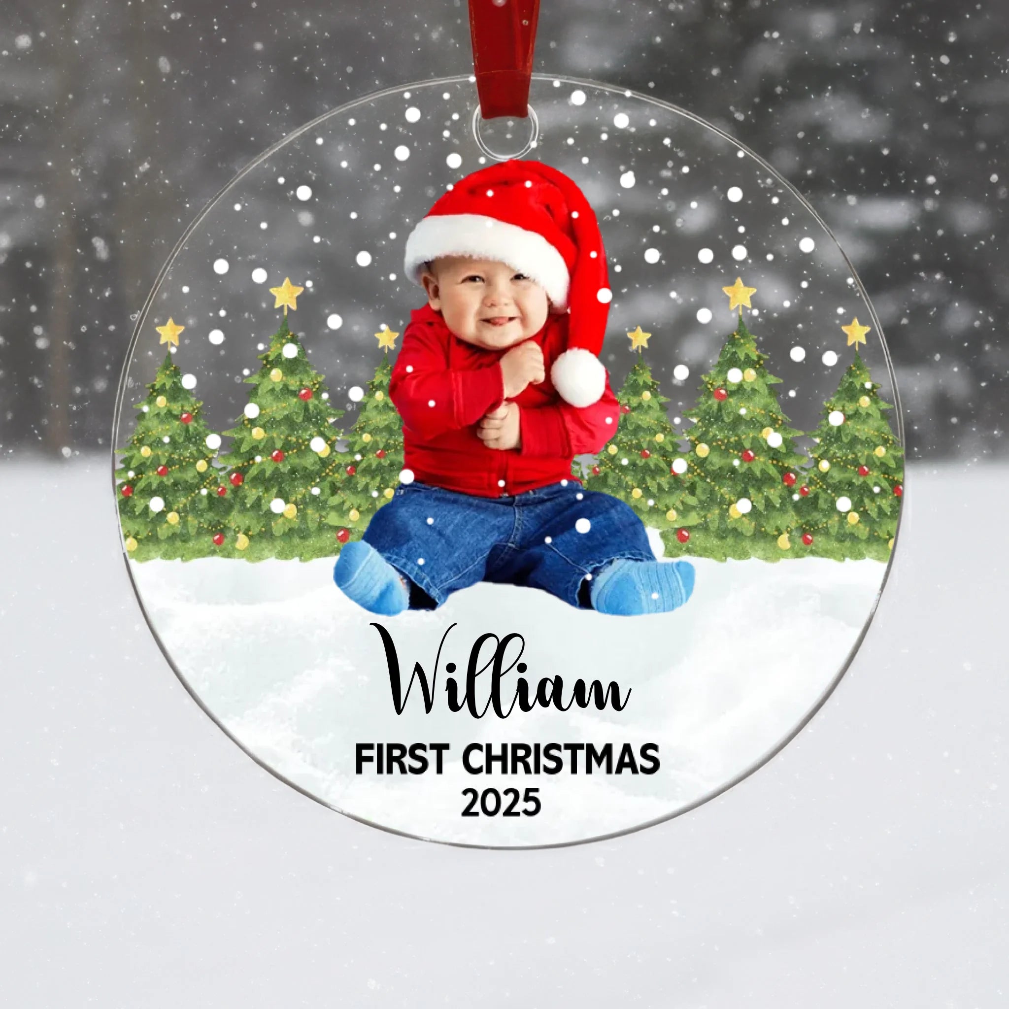 Celebrate your baby’s very first Christmas with a beautifully personalized acrylic ornament featuring your baby’s photo, name, and custom text color. This adorable keepsake captures the magical moment of your child’s first holiday season and turns it into a treasured memory you can display year after year. Perfect for decorating your Christmas tree, gifting to loved ones, or keeping as a lifelong memento.