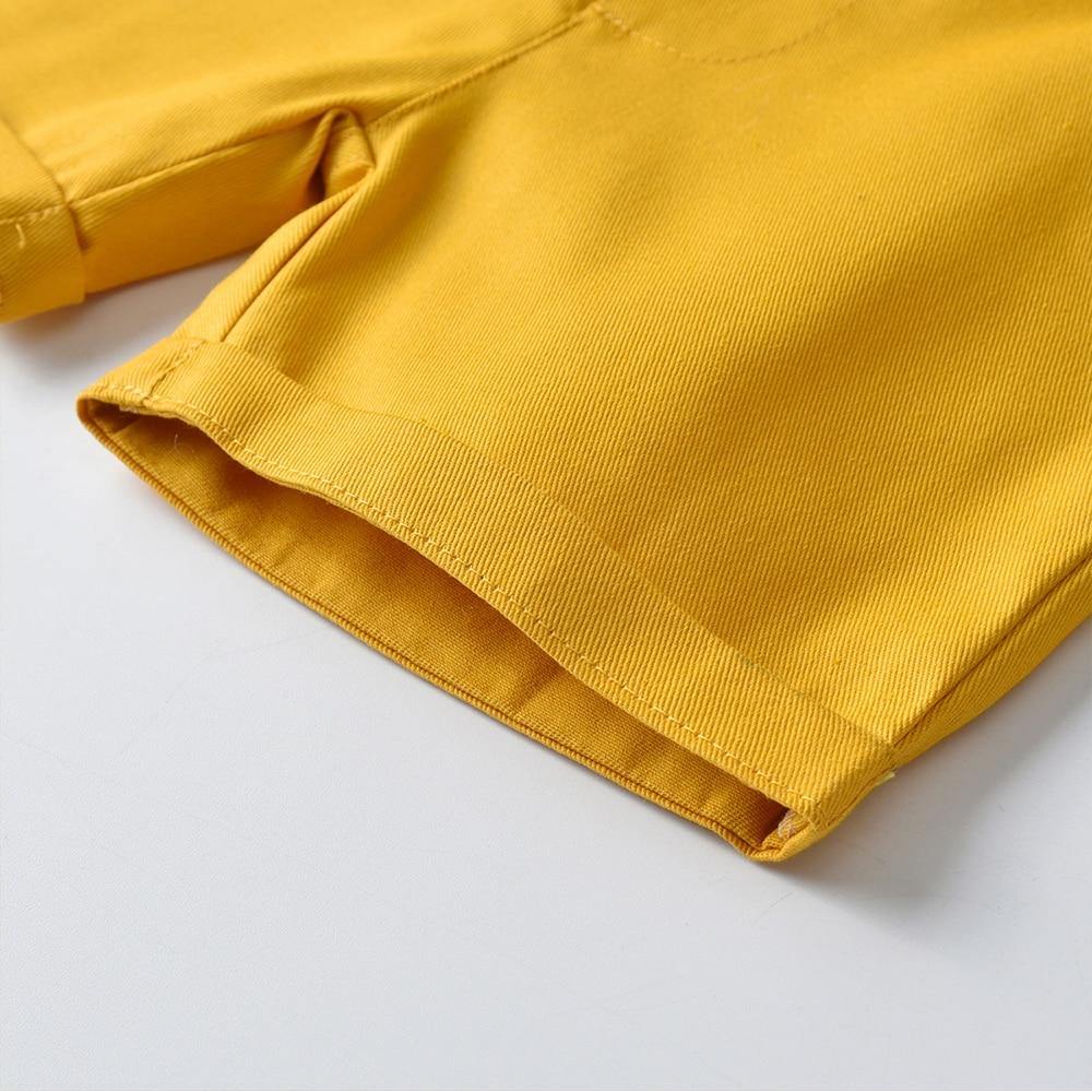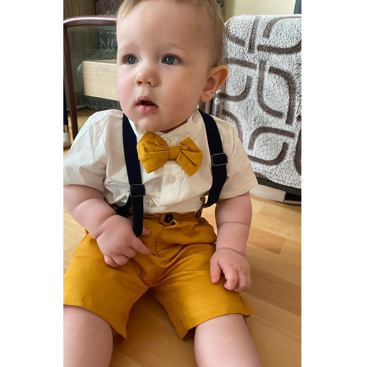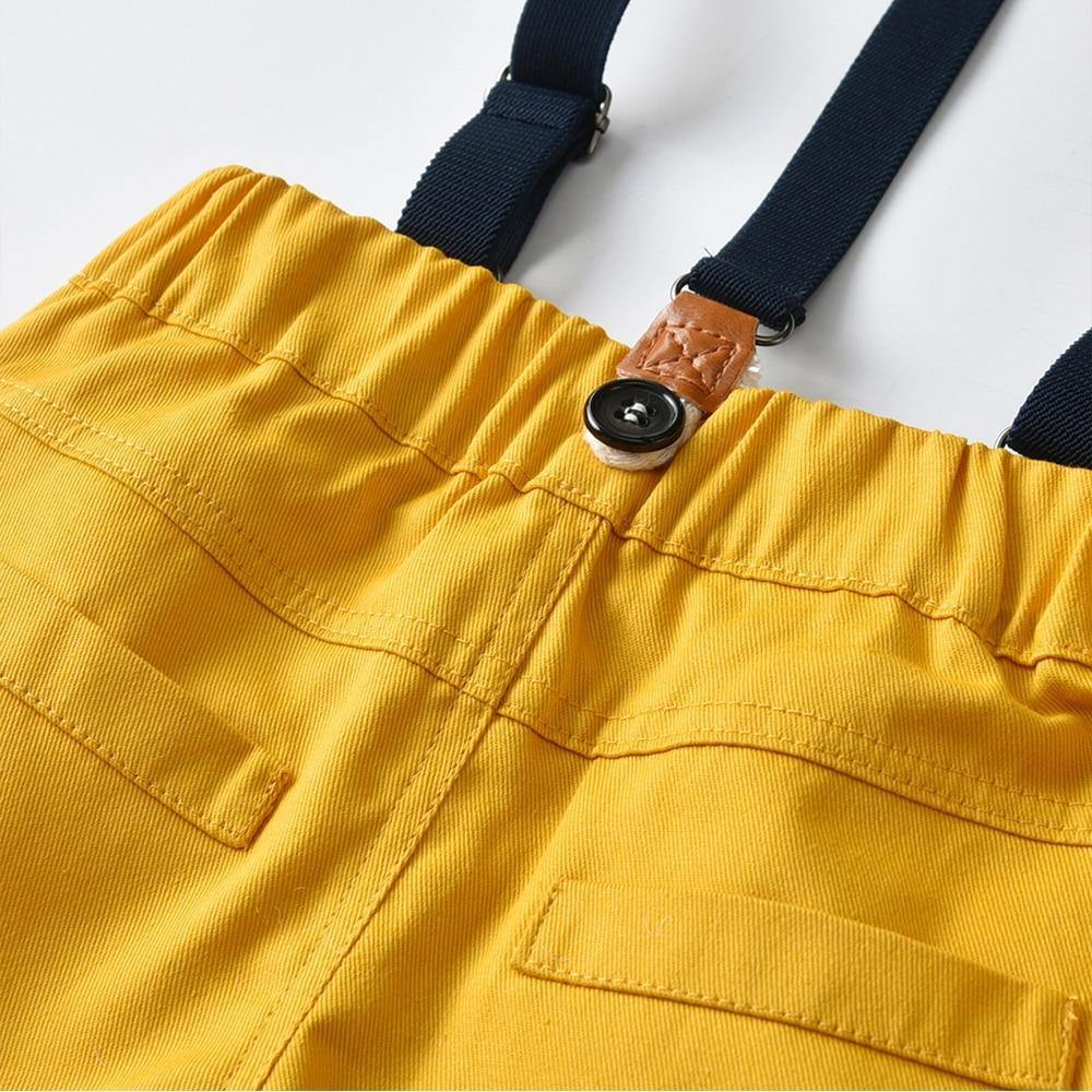 Presenting our adorable “Baby Boy Tuxedo Dress” for your little ones, made with high-quality cotton that feels super soft on your baby’s skin. It includes a beautiful white dress shirt, yellow pants with front and back pockets that add an adorable touch to it. The tuxedo dress also includes suspenders with leather buckles and an adorable yellow bow tie. A perfect outfit for your little one to wear in casual events.