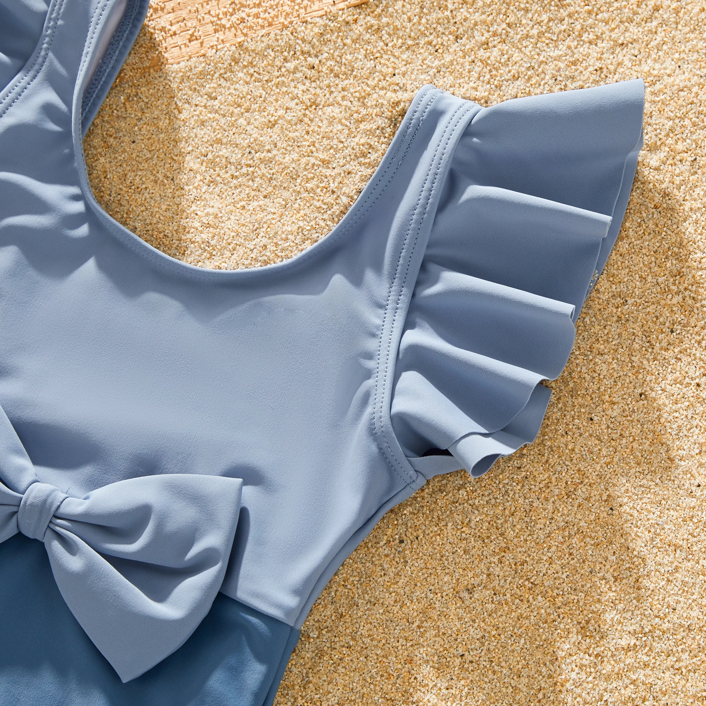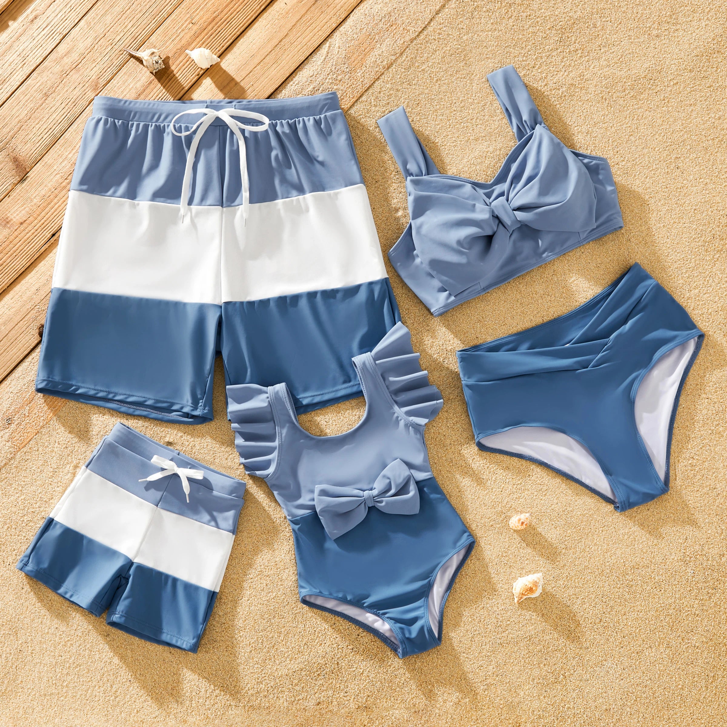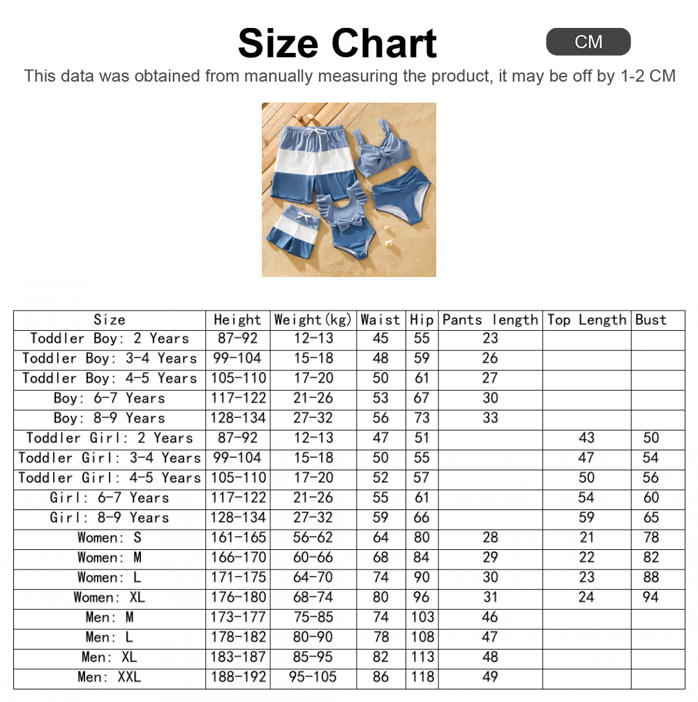 Product Introduction: Elevate your family's beach style with our stunning Blue Family Matching Swimwear Set. Designed with chic big bow knot details and crafted from elastic fabric, this swimwear set ensures both style and comfort for every member of the family. The Morandi color scheme adds a touch of sophistication, while the combination of deep blue, light blue, and white creates a harmonious and fashionable look that's perfect for any beach outing, pool party, vacation, or swimming adventure.