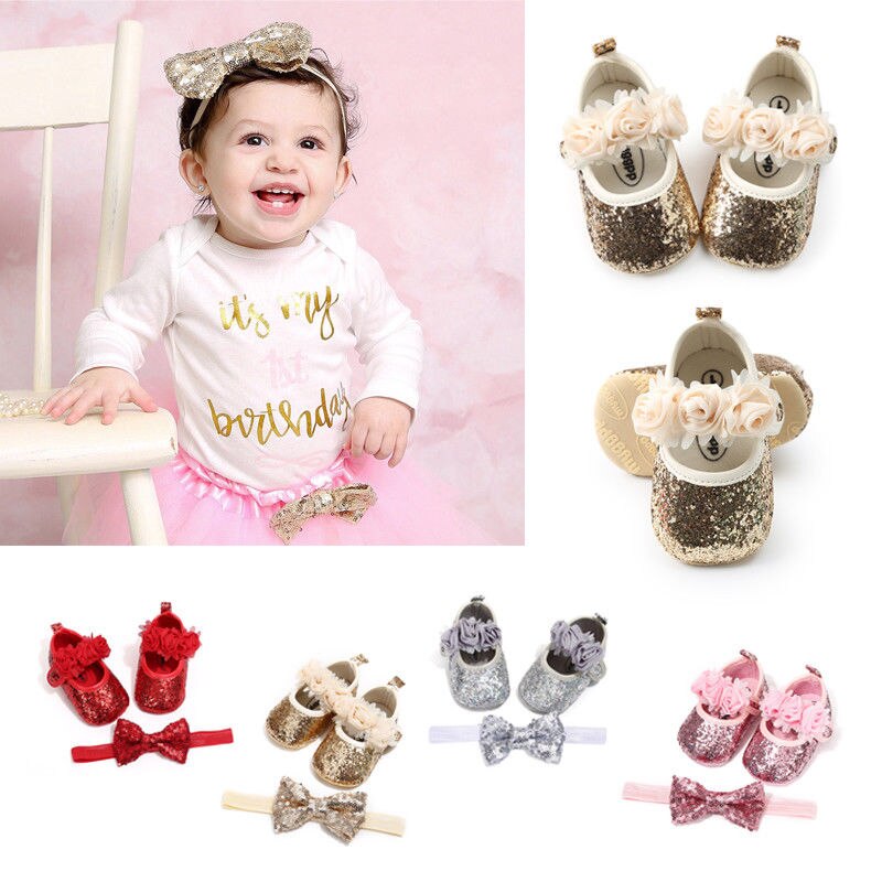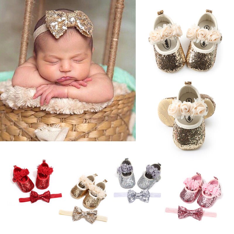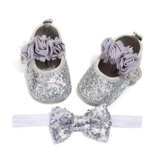 Let your little princess shine as these shimmering Bowknot Sequins Shoes + Headband Set. Professionally designed and made to perfectly fit your baby's fashionable wear! A soft and flexible shoes for comfortable footwear with a matching cute ribbon headband that's a very suitable gift to babies.